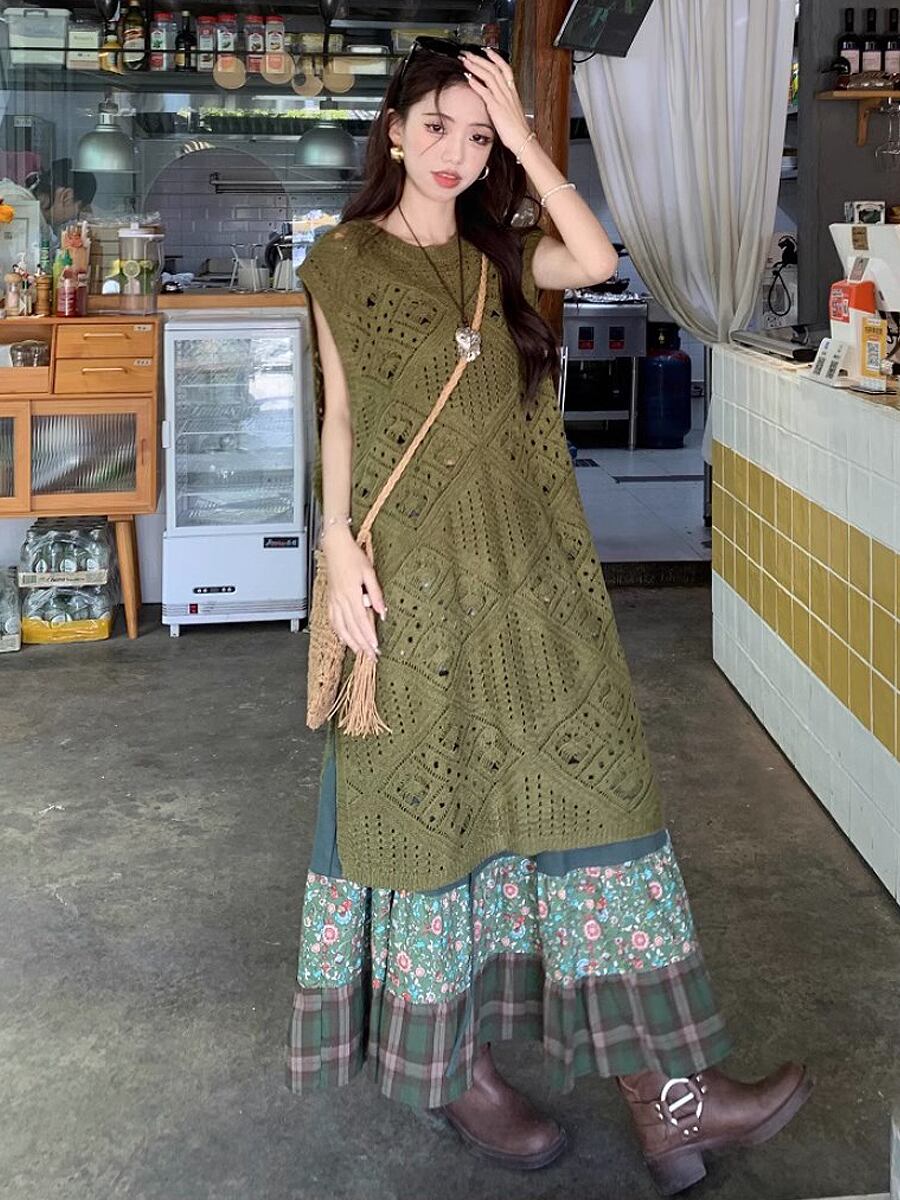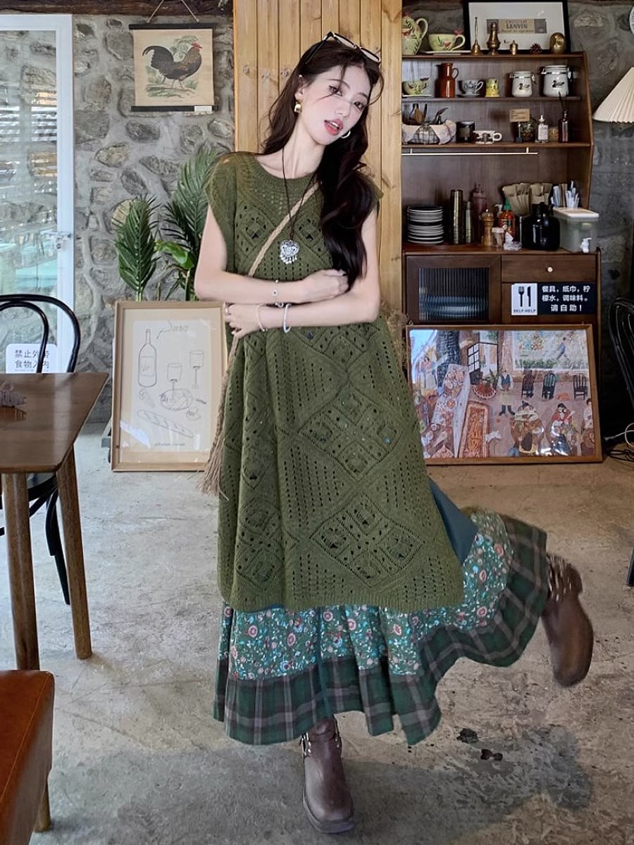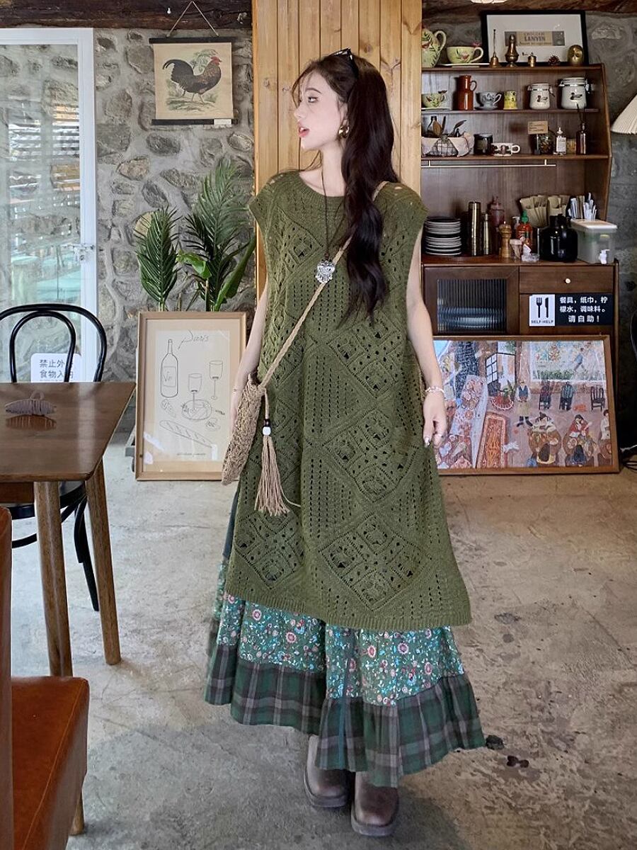 2点セット かぎ針編みロングベスト+パッチワーク風ティアードスカート クロシェ編み 透かし編み ダークグリーン グリーンティー 抹茶色 くすみグリーン 花柄 チェック くすみブルー 小花柄 段々フリルスカート 段々スカート レディース ゆったり ラフ 可愛い 大人可愛い リゾート かっこいい 大人 個性的 薄手 きれいめ セレブ カワイイ 脚長 おしゃれ デート お出かけ 存在感 こなれ感 抜け感 楽ちん デイリー インスタ映え 冷房対策 韓国コーデ 韓国ファション