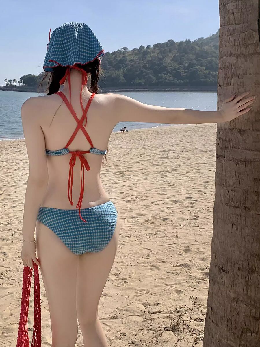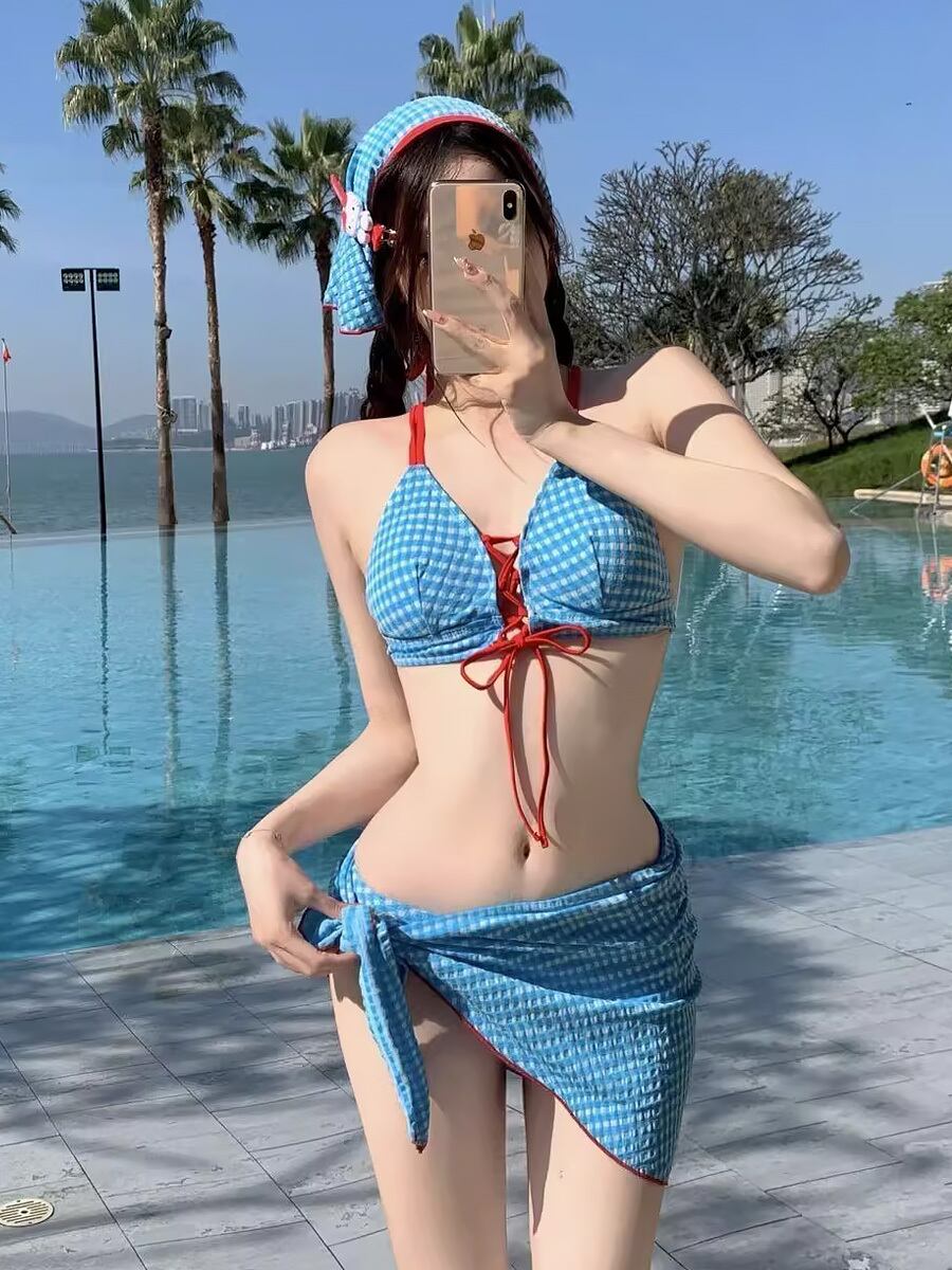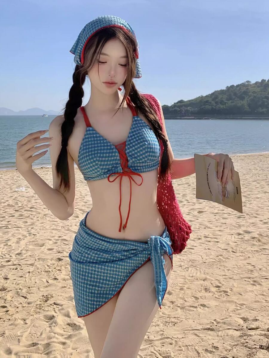 3点セット 水着 ビキニ フロントレースアップビキニ上下+パレオ ブルー 青 紐別色 リボン赤 赤リボン 編み上げ レースアップ おまけつき 三角ビキニ 露出多め レトロ レトロ感 セクシー ガーリー パット付き ワイヤーなし ノンワイヤー かわいい 大人可愛い フェミニン おしゃれ ラブリー キュート レディース 女の子 海 ビーチ プール リゾート 美脚 脚長 着痩せ 韓国系 オルチャン 韓国ファション 韓国コーデ