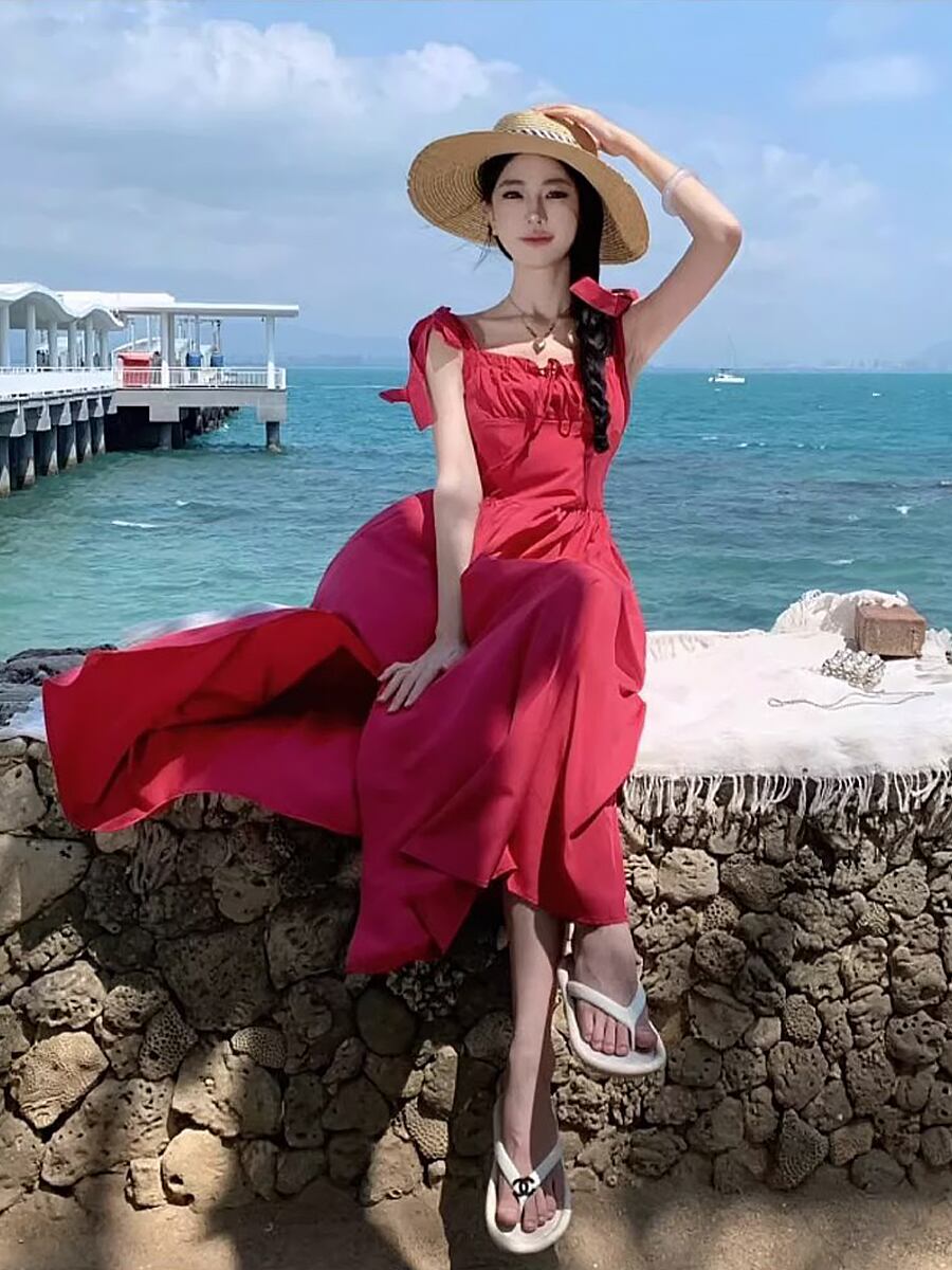 肩リボンスリットキャミソールワンピース キャミワンピ キャミソールワンピース 夏ワンピ レッド 赤 切替えデザイン シャーリング 夏ワンピ サマードレス ワンピドレス ロング ロング丈 ミモレ スマート かわいい 大人可愛い きれいめ シンプル カジュアル おしゃれ お洒落 かっこいい レトロ 大人女子 こなれ感 ラフ ラブリー キュート 個性的 クール モード系 エレガント 韓国コーデ 韓国ファッション ストロベリーレッド