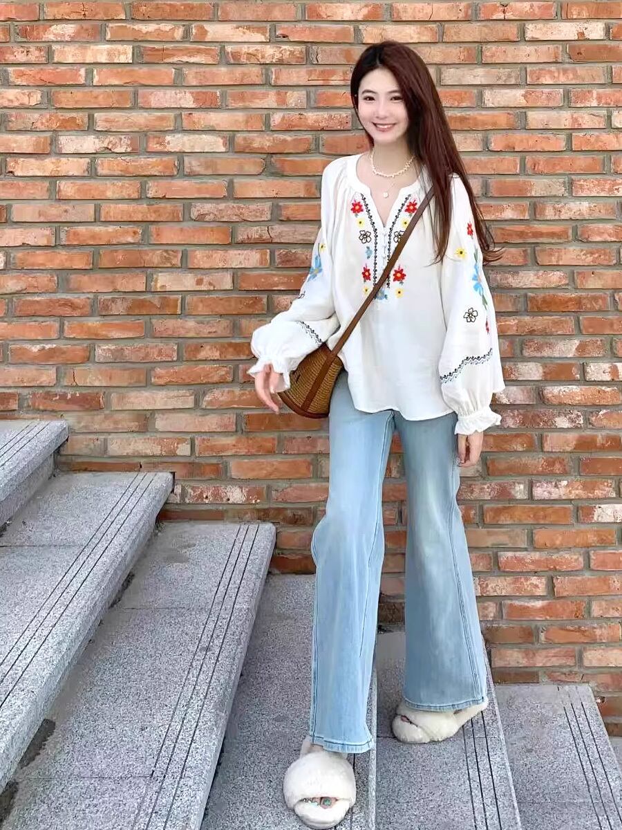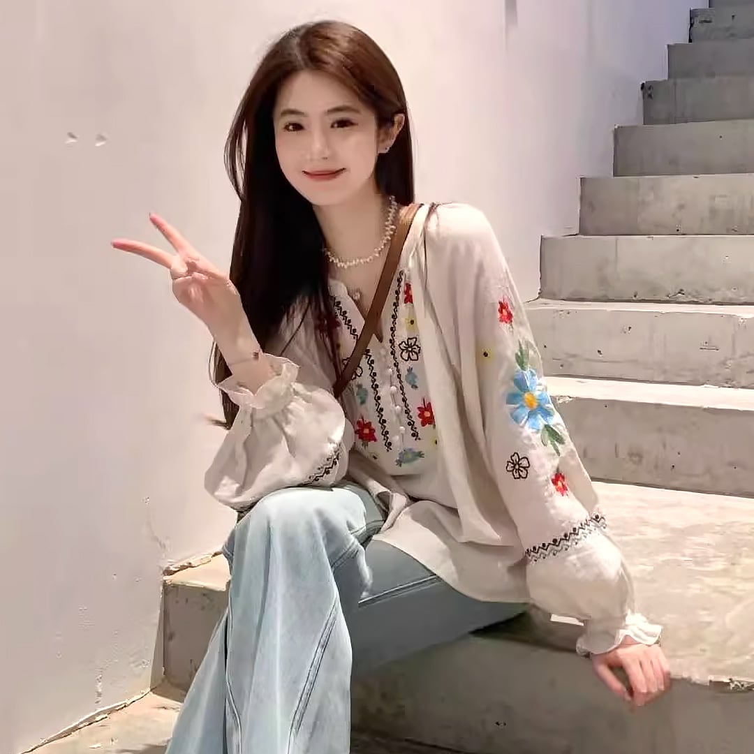 袖とフロントに花柄の刺繍がはいったエスニック風のヘンリーネック長袖ブラウスです。