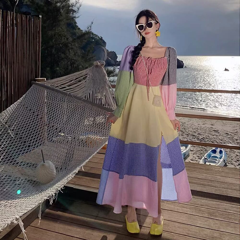 チェック柄スクエアネック長袖ワンピース パッチワーク風 カラフル サマーワンピース ワンピース 重ね着風 スリット レトロ ドレス 夏ワンピ 日焼け防止 リゾートワンピース スクエアネック フレア Aライン 夏ワンピース 肩見せ ロング カジュアルレトロ柄 オシャレ 楽ちん リラックスワンピ 大人女子 こなれ感 ラブリー キュート エレガント モダン 主役級 とろみ感 抜け感 お出かけ 韓国コーデ 韓国ファッション