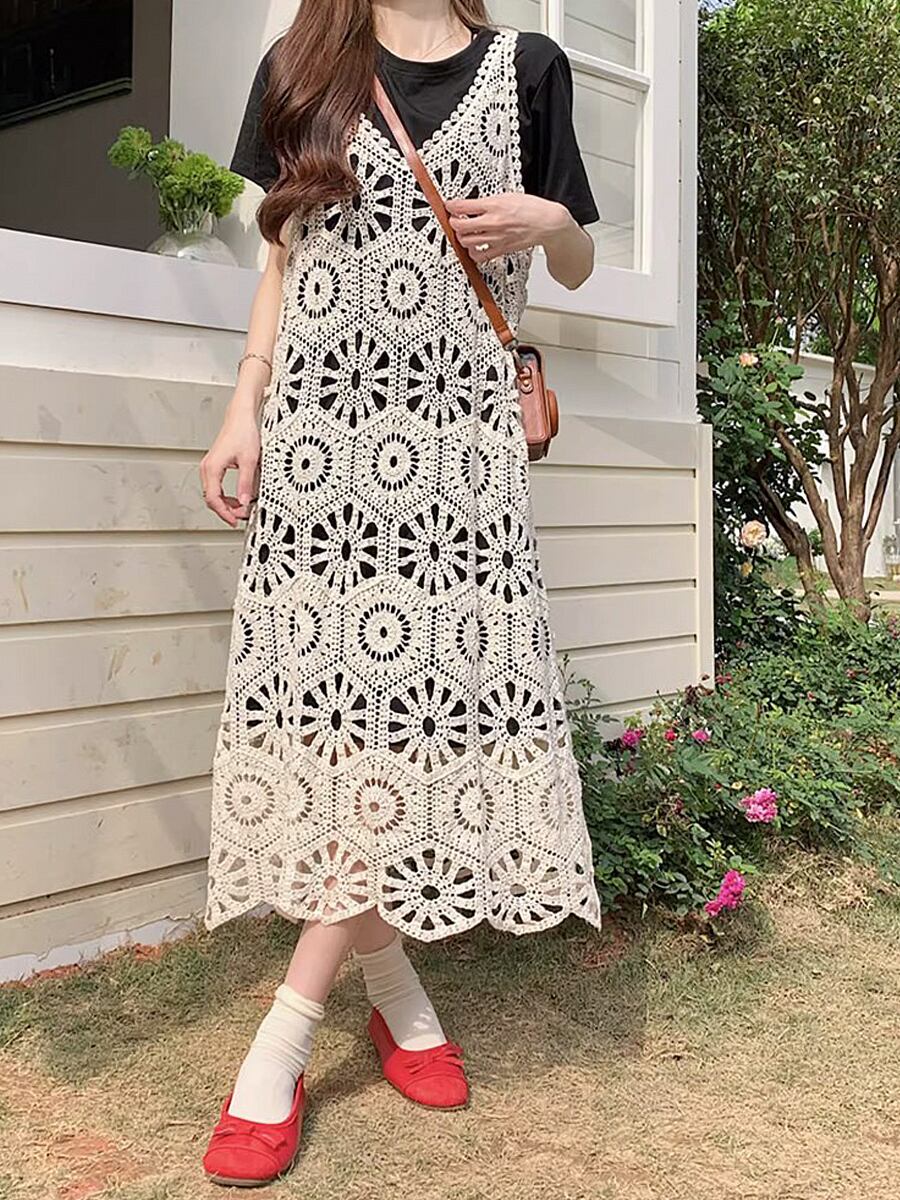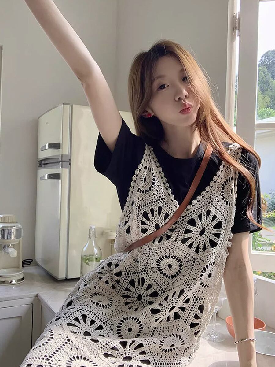透かし編みロングニットジレ ロングジレ ロングベスト ワンピース ジレ ジャンパースカート ベスト かぎ針編み ベスト 透かし編み 透け感 モチーフ編み ラウンドネック かわいい 大人可愛い きれいめ シンプル 大人 おしゃれ かっこいい 大人女子 こなれ感 ラフ キュート 春 夏 レディース デート お出かけ レイヤードコーデ 旅行 着回し 普段使い 重ね着 韓国 ファッション コーデ 脚長 韓国コーデ 韓国ファッション ホワイト 白