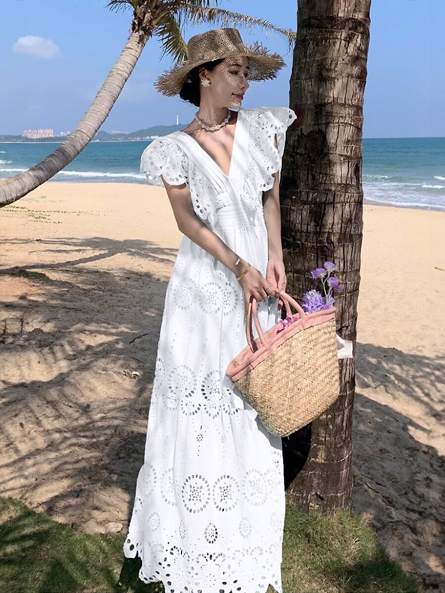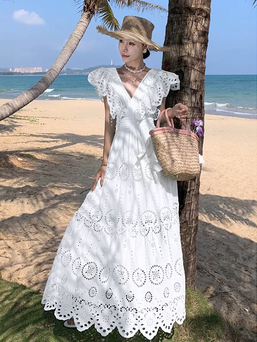 ざっくり開いたVネックでデコルテラインが綺麗に見えるコットンレースのロングワンピースです。