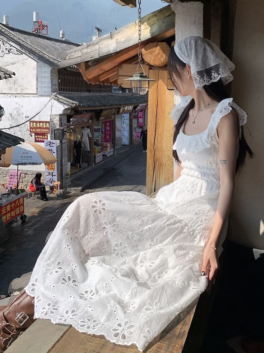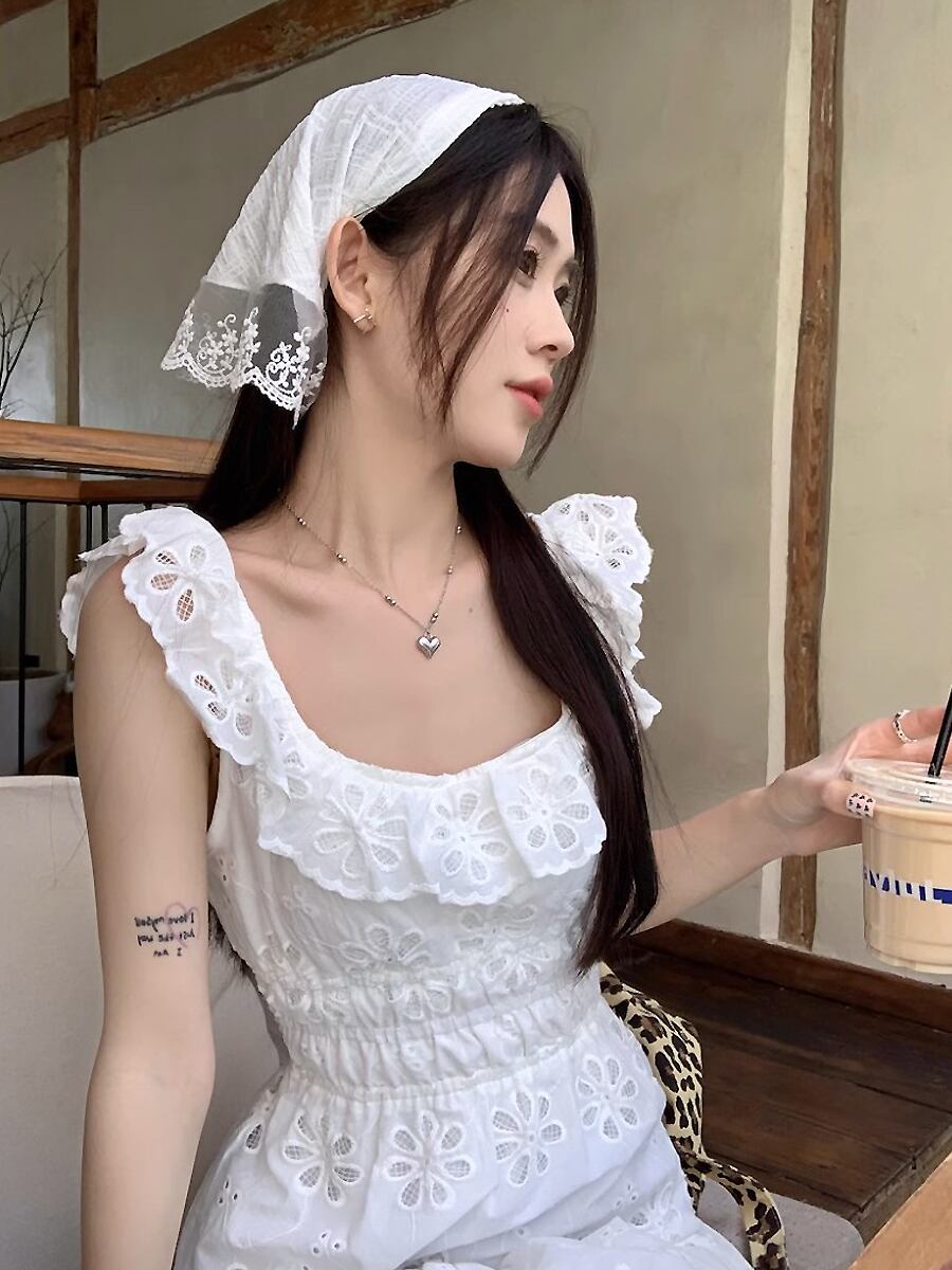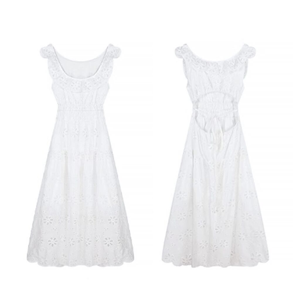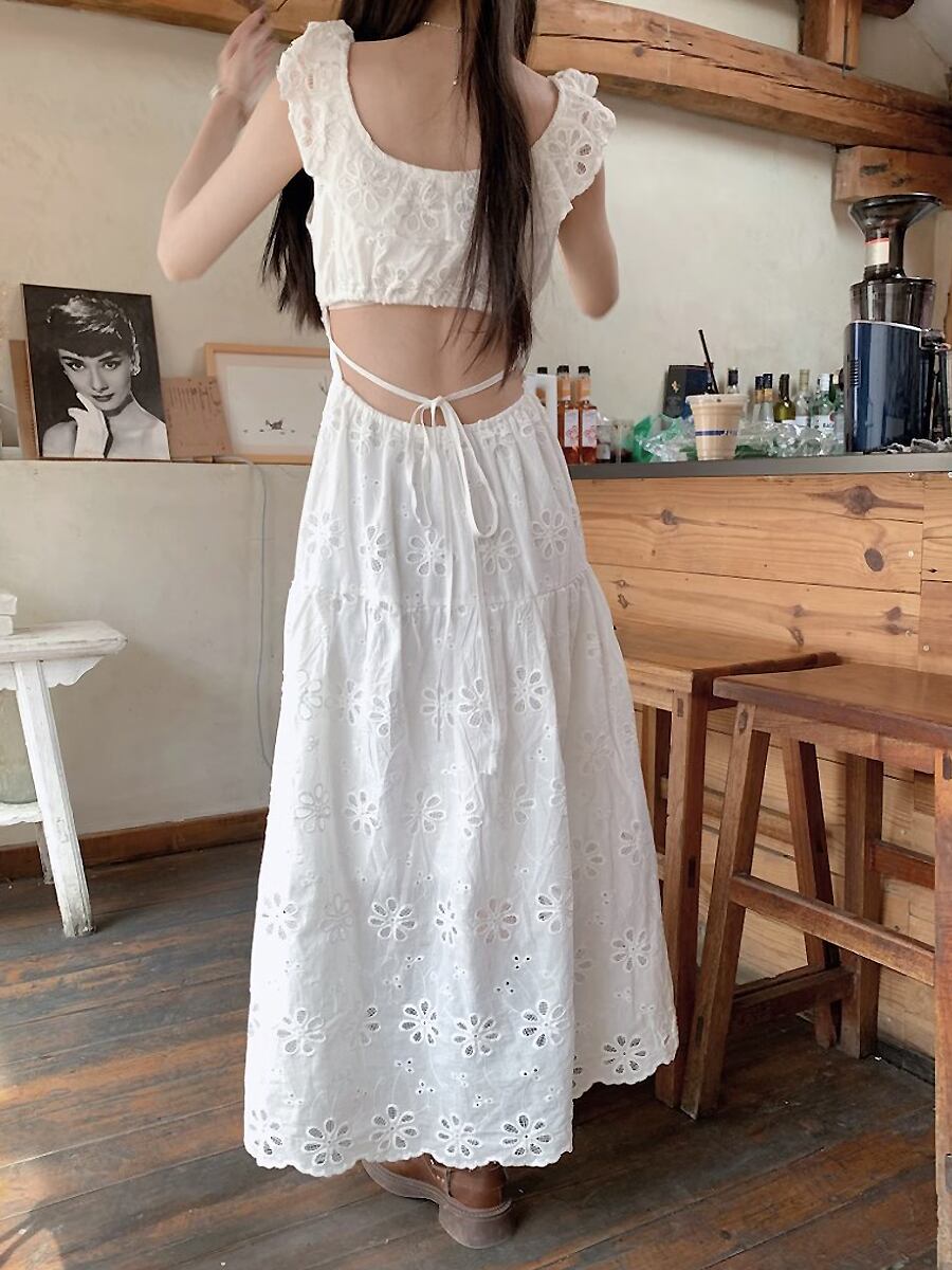 バックオープン透かしレースロングワンピース フライングスリーブ フレンチウエスト 背中開き カットアウト 綿レース Aライン ギャザー フレア ワンピース 可愛い カジュアル 大人 おしゃれ 大人可愛い 大人女子 キュート ガーリー 春 夏 大人可愛い きれいめ シンプル 大人 上品 おしゃれ 大人女子 レディース 通学 デート お出かけ 女子会 イベント リゾート 旅行 普段使い 休日 お揃い オルチャン 韓国コーデ 韓国ファッション ホワイト 白