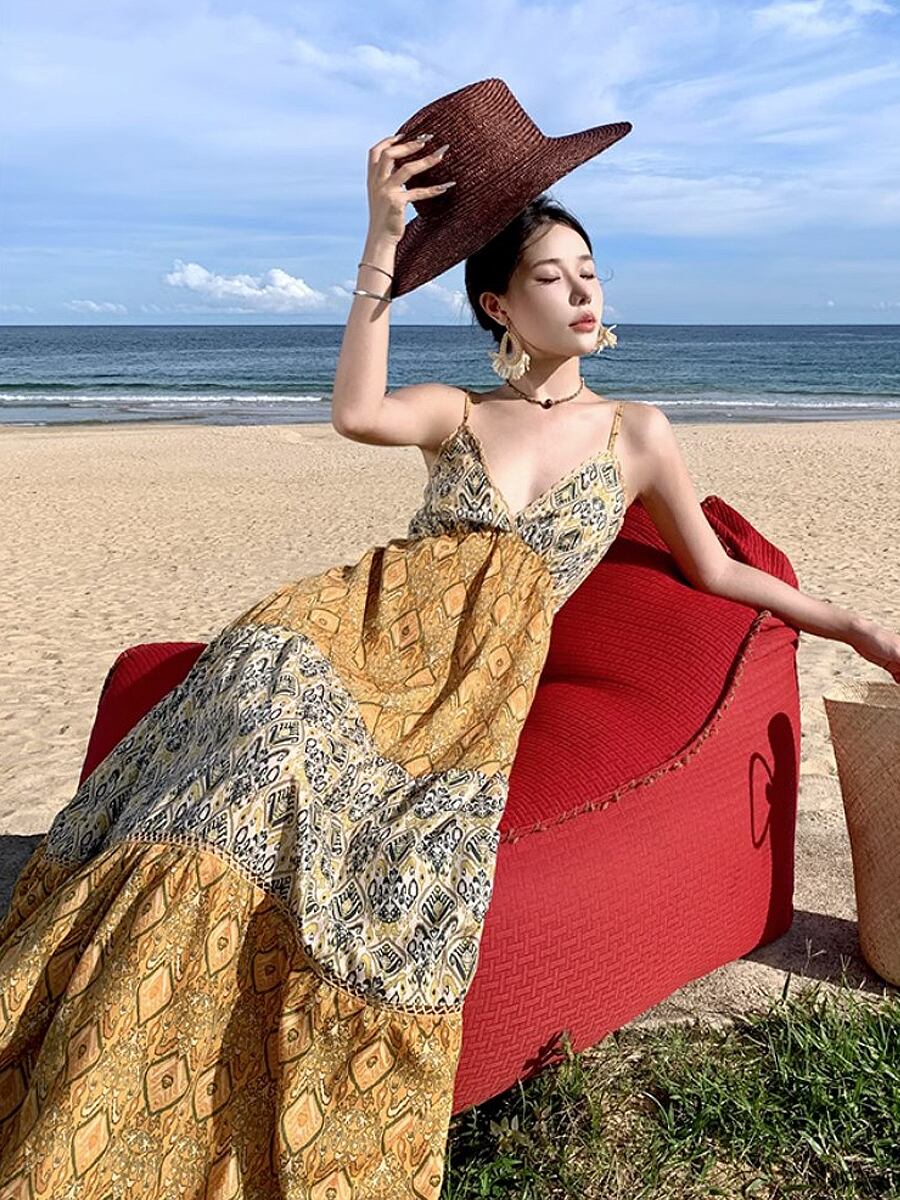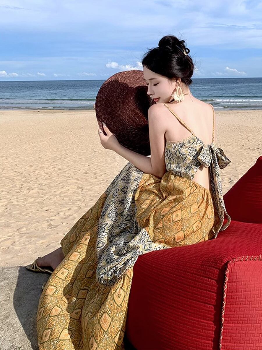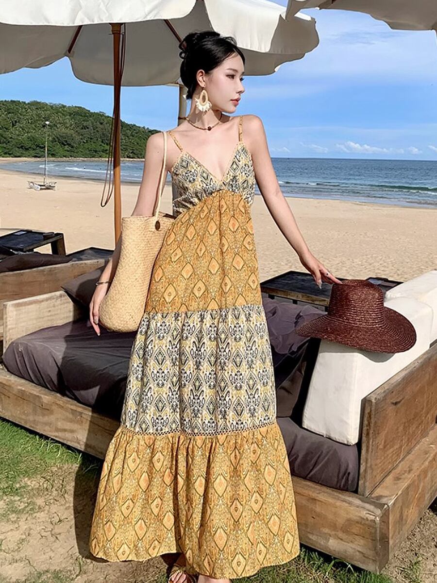 バックオープンティアードロングワンピース キャミワンピ キャミソールワンピース エスニックプリント フォークロア ボヘミアン 背中開き カットアウト Aライン ギャザー フレア ワンピース 可愛い カジュアル 大人 おしゃれ 大人可愛い 大人女子 キュート ガーリー 春 夏 大人可愛い きれいめ シンプル 大人 上品 おしゃれ 大人女子 レディース デート イベント リゾート 旅行 普段使い 休日 お揃い オルチャン 韓国コーデ 韓国ファッション くすみイエロー 黄色 茶色