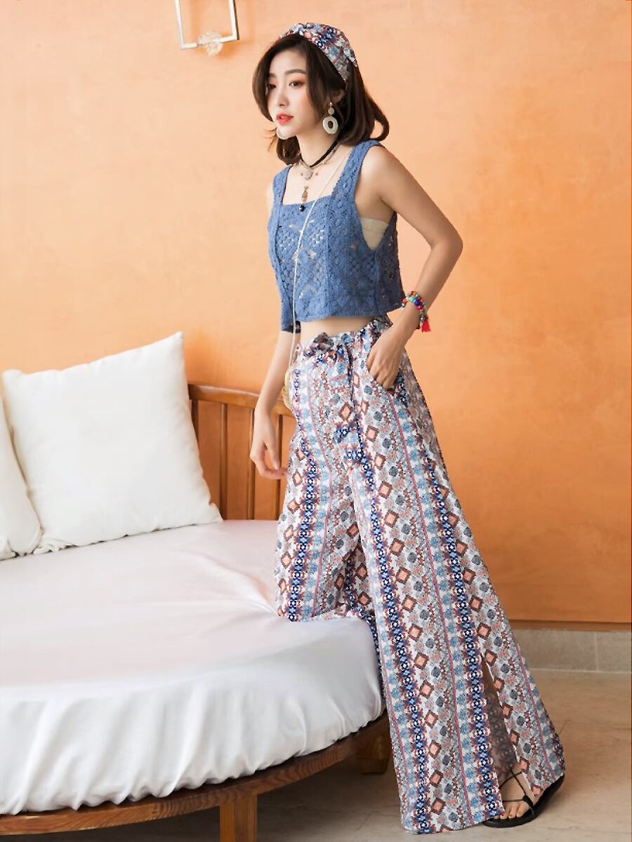 エスニック柄サイドスリットワイドパンツ ホリデーパンツ ドレープ フロアパンツ エスニックワイドパンツ ロング ロングパンツ フレアパンツ タック フレア ハイウエスト ワイド ウエストリボン リボン フォークロア リボン ウエストマーク かわいい 大人可愛い きれいめ シンプル カジュアル 上品 おしゃれ お洒落 かっこいい レトロ 大人女子 こなれ感 ラフ 個性的 エレガント モダン 主役級 存在感 抜け感 無地 デート お出かけ 韓国コーデ 韓国ファッション エスニックチェック