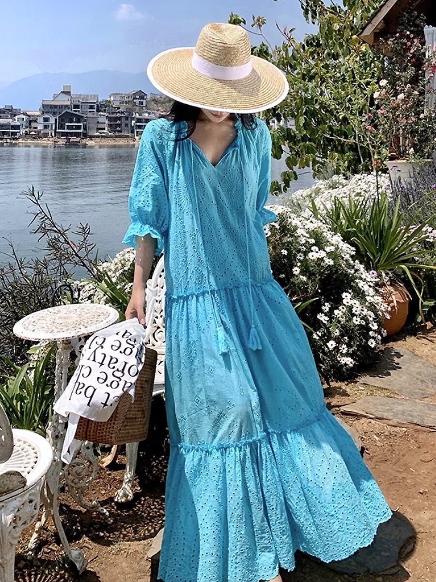 五分袖裾レース刺繍ティアードワンピース 刺繍 花柄刺繍 フレアワンピース ティアードワンピース ワンピドレス ロング 段々フリル 日焼け防止 夏ワンピース 五分袖 Aライン 切り替えデザイン シャーリング かわいい 大人可愛い きれいめ シンプル カジュアル おしゃれ お洒落 かっこいい レトロ 大人女子 ラブリー キュート ガーリー エレガント 主役級 存在感 韓国ファッション 韓国コーデ スタイル 高見え 格上げ モテ インスタ映え ブルー 青 水色
