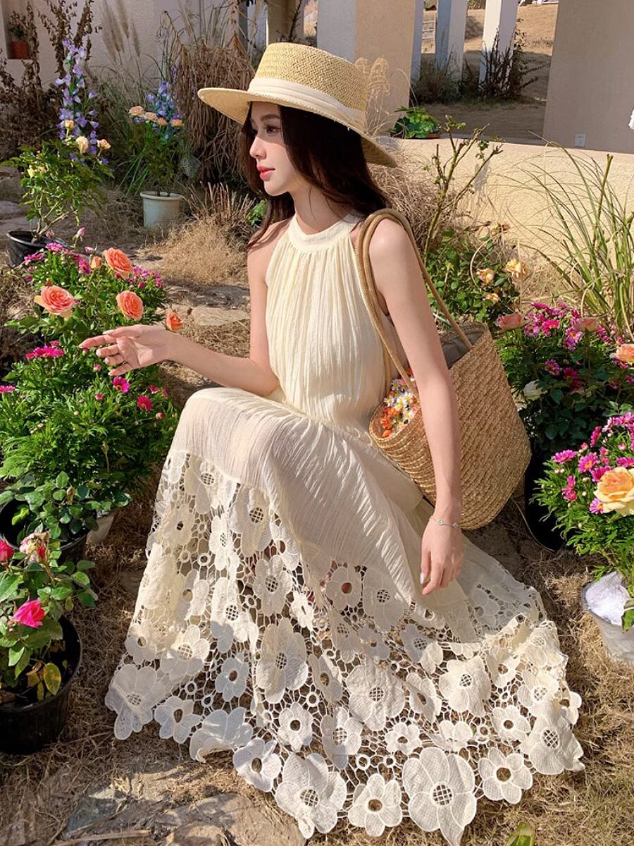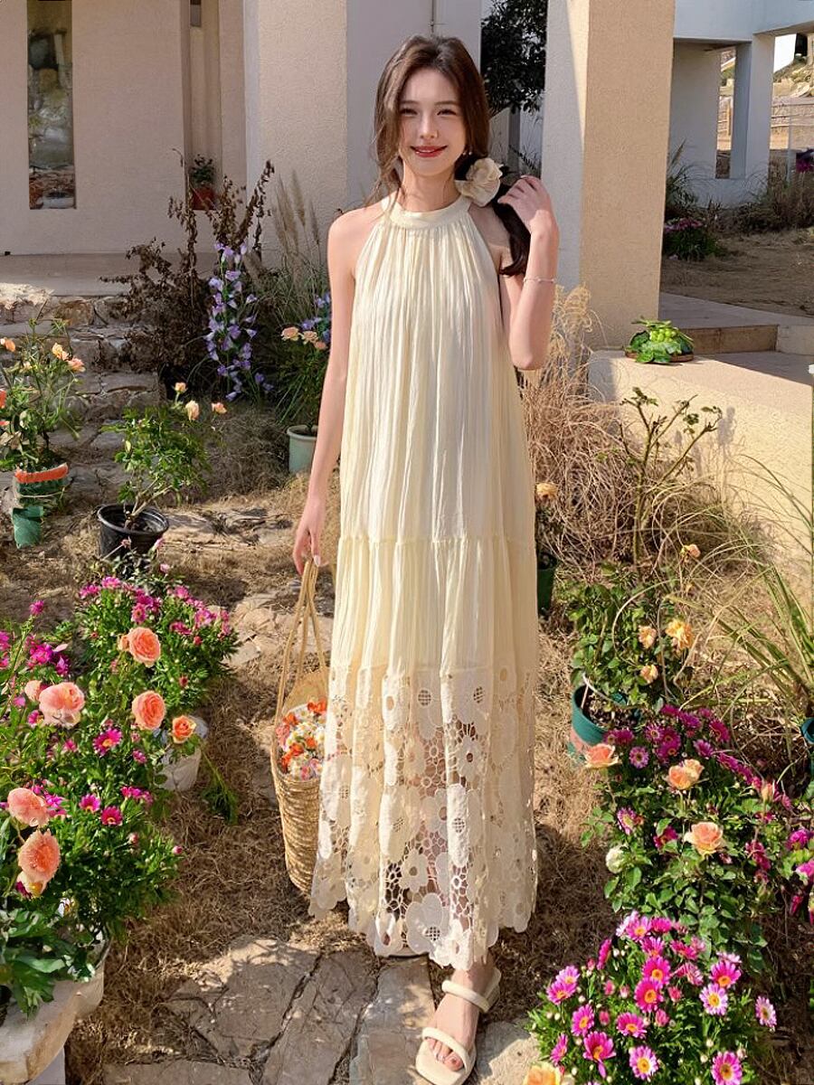 アメリカンスリーブ裾レース刺繍ティアードワンピース 刺繍 花柄刺繍 フレアワンピース ティアードワンピース アメリカンスリーブ ノースリーブ ワンピドレス ロング 段々フリル 夏ワンピース Aライン ホルターネック かわいい 大人可愛い きれいめ シンプル カジュアル おしゃれ お洒落 かっこいい レトロ 大人女子 ラブリー キュート ガーリー エレガント 主役級 存在感 韓国ファッション 韓国コーデ スタイル 高見え 格上げ モテ インスタ映え 白 ホワイト アプリコット