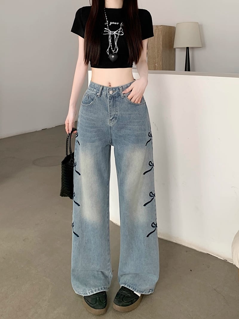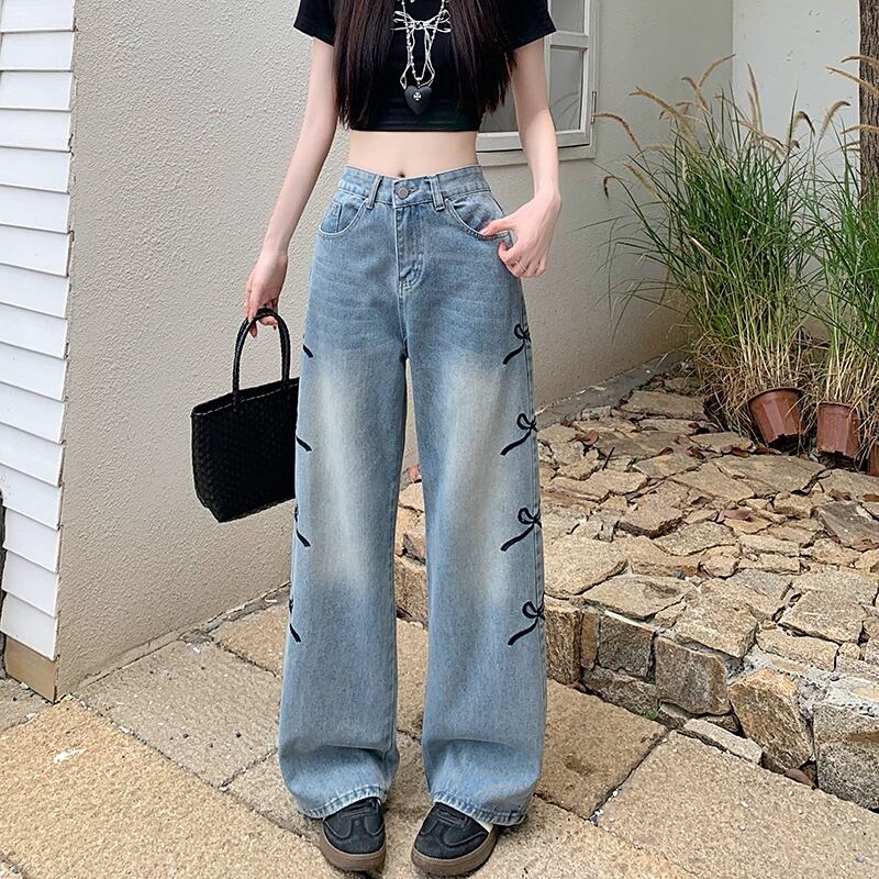 サイドリボン刺繍ロングデニム パンツ ハイウエスト ワイドルーズデニム リボン フロアレングス 刺繍 ワイドレッグ レトロ 体型カバー ヴィンテージ風 かわいい 大人可愛い ジーパン カジュアル 大人 おしゃれ お洒落 かっこいい 大人可愛い 大人女子 こなれ感 ラフ ラブリー キュート ガーリー 個性的 レディース 学生 通学 デート お出かけ 公園デビュー 女子会 休日 リゾート 旅行 韓国コーデ 韓国ファッション ブルー