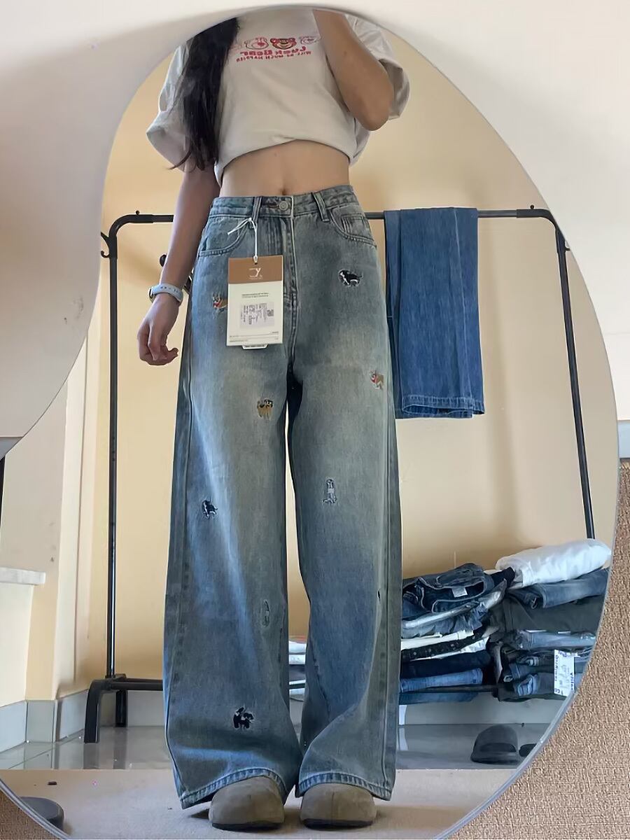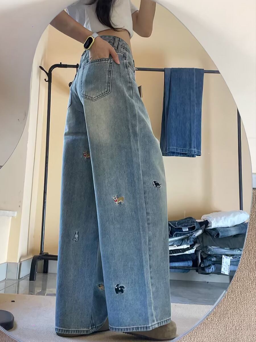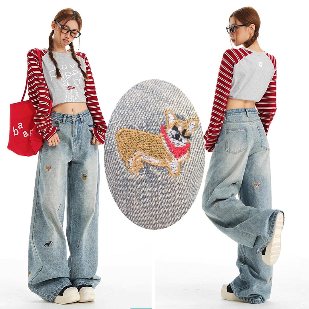 長さ2種類 ドッグ刺繍ロングデニムパンツ ハイウエスト ストレート ルーズデニム ペット柄刺繍 ワンコ柄 ワンちゃん柄 犬 子犬柄 フロアレングス 刺繍 ウォッシュ加工 レトロ 体型カバー ヴィンテージ風 かわいい 大人可愛い ジーパン カジュアル 大人 おしゃれ お洒落 かっこいい 大人可愛い 大人女子 こなれ感 ラフ ラブリー キュート ガーリー 個性的 レディース 学生 通学 デート お出かけ 公園デビュー 女子会 休日 リゾート 旅行 韓国コーデ 韓国ファッション ブルー