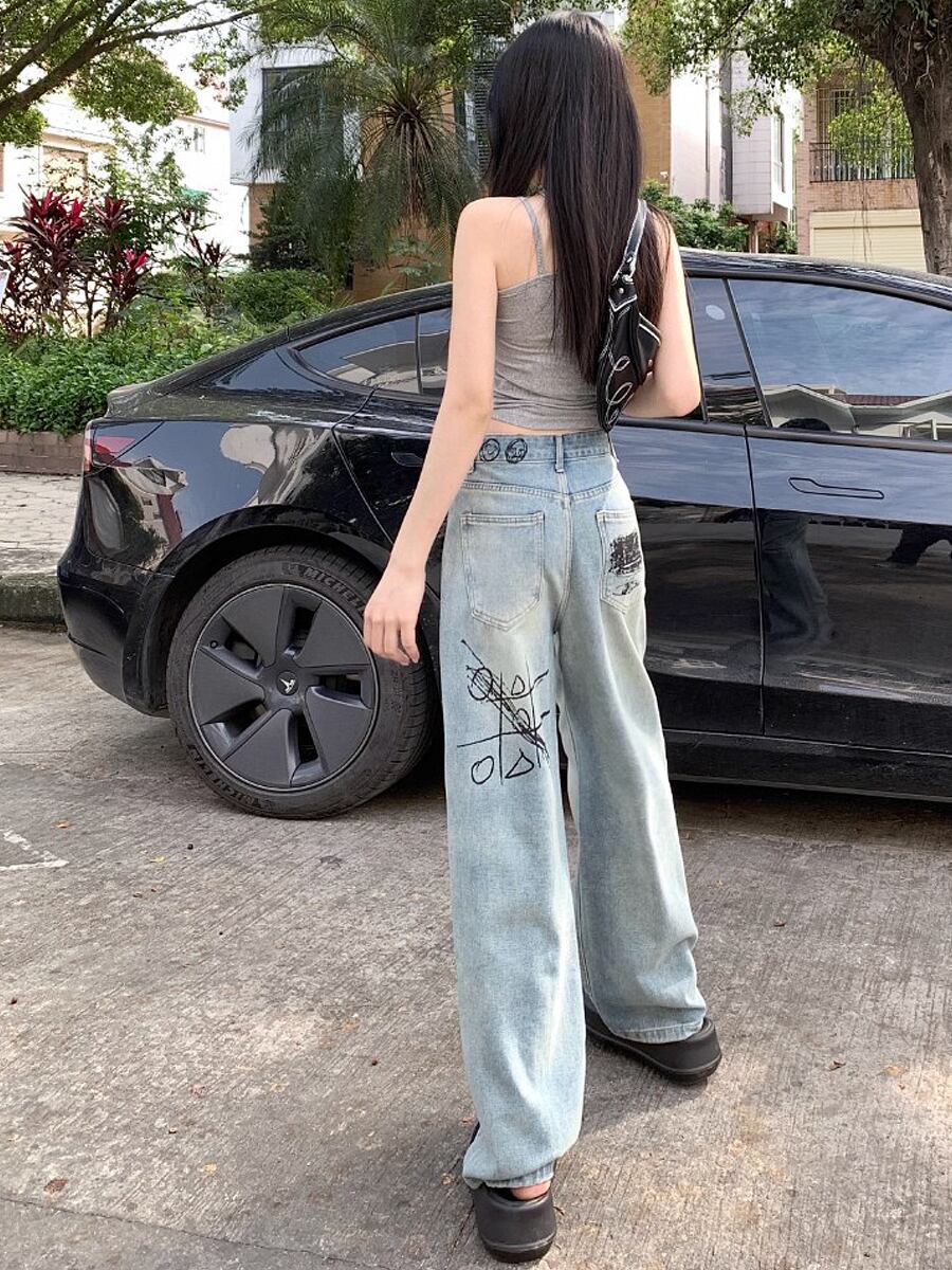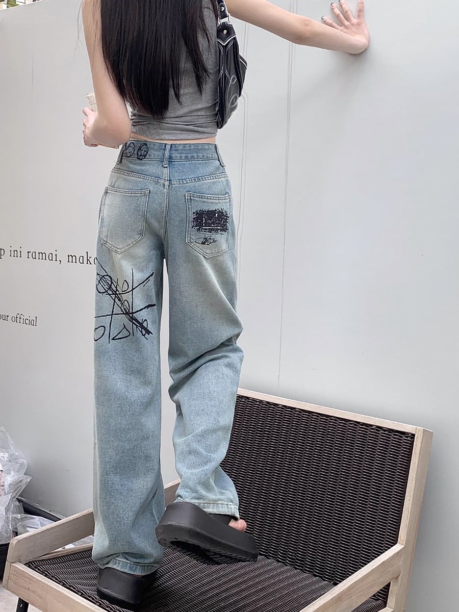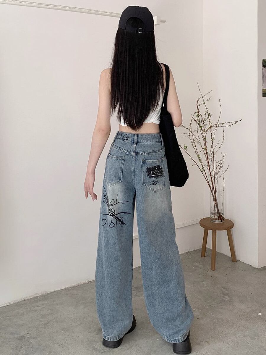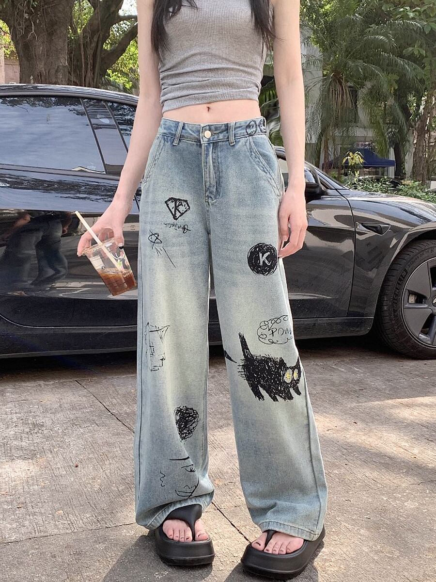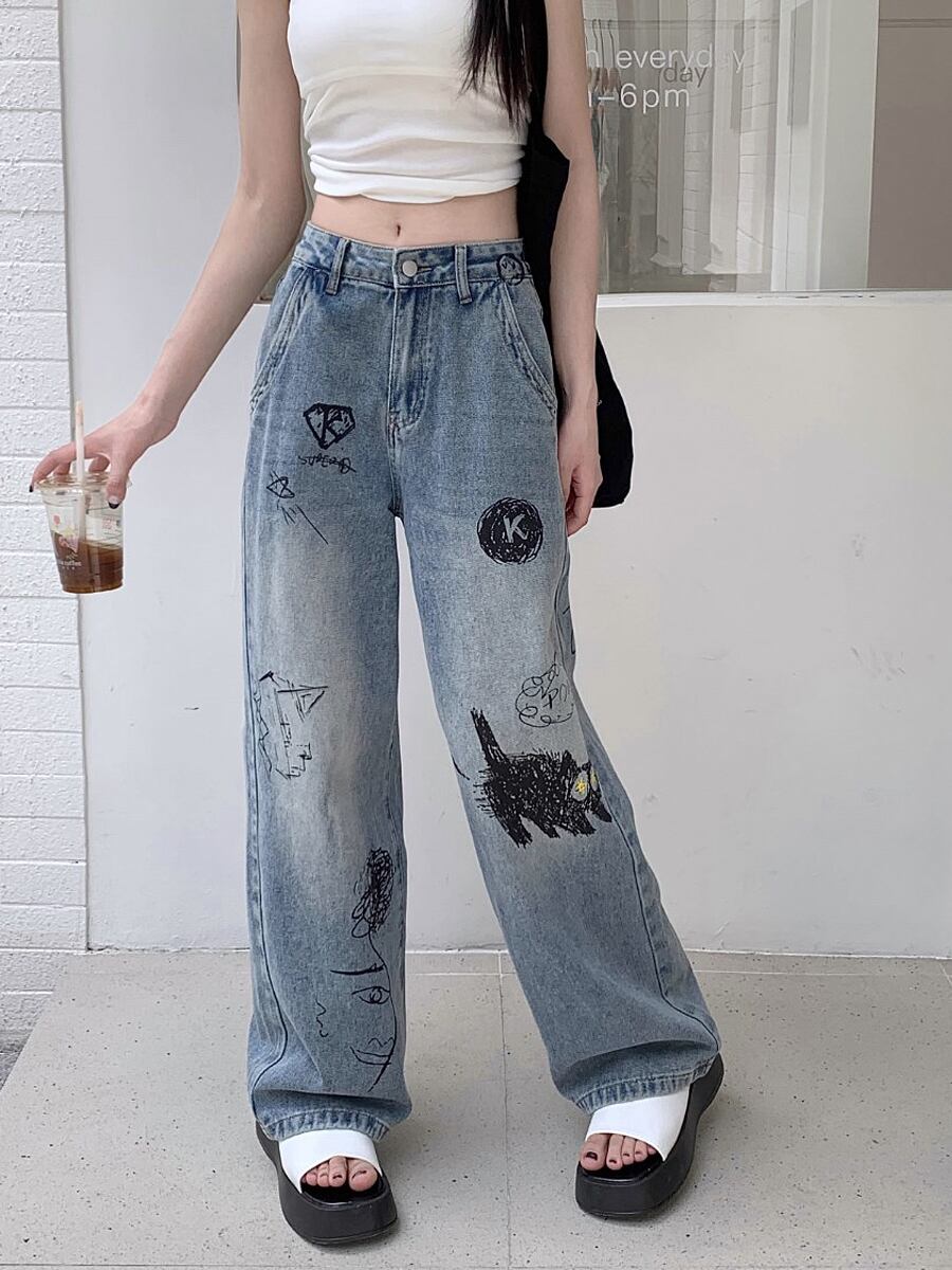 らくがき風イラストプリントロングデニムパンツ ハイウエスト 落書き いたずら書き 猫イラスト いたずら書き風 落書き風 ワイドシルエット ワイド ビンテージ風 ルーズデニム ストリート ライトブルー 水色 ワイドパンツ かわいい 大人可愛い きれいめ カジュアル ストリート系 大人 おしゃれ お洒落 かっこいい 大人可愛い 大人女子 こなれ感 ラフ ラブリー キュート ガーリー 個性的 レディース 学生 通学 デート ブルー 韓国コーデ 韓国ファッション