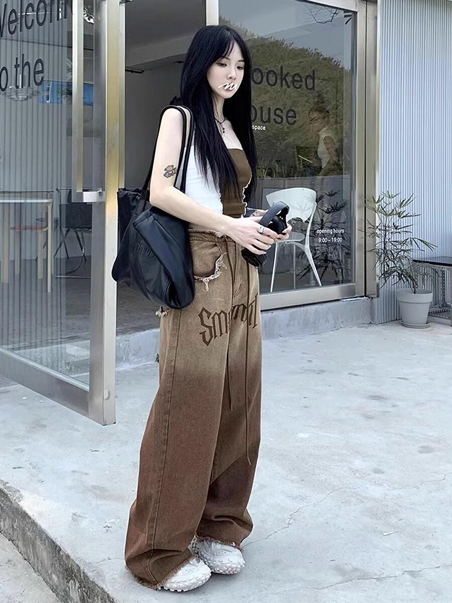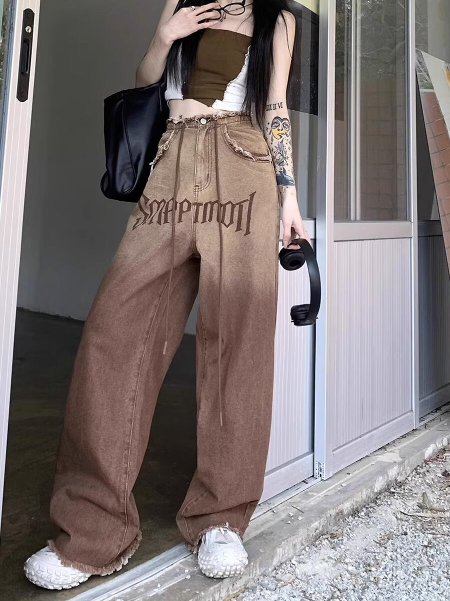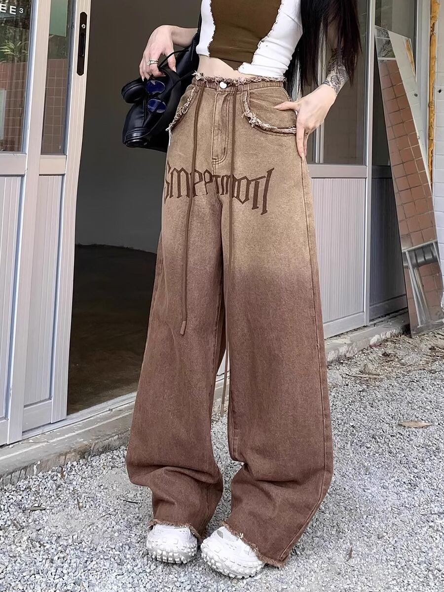 グラデーションフリンジヘムロングデニムパンツ グラデーション ブラウン 茶色 モカブラウン 切りっぱなし加工 切りっぱなし カットオフ ディストレストヘム ハイウエスト ワイドシルエット ワイド ストリート ジーンズ ジーパン フロアモップパンツ パンツ かわいい 大人可愛い きれいめ カジュアル ストリート系 大人 おしゃれ お洒落 かっこいい 大人可愛い 大人女子 こなれ感 ラフ ラブリー キュート ガーリー 個性的 レディース 学生 通学 デート 韓国コーデ 韓国ファッション