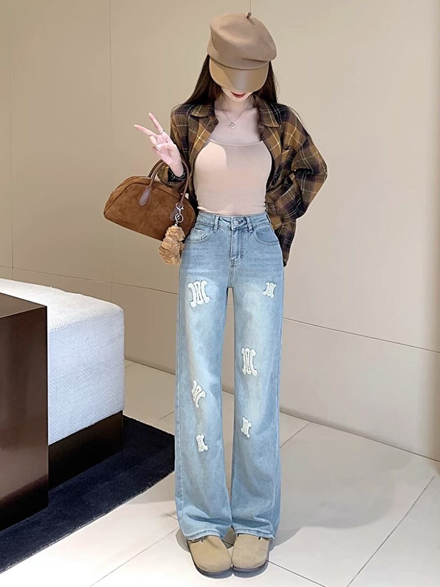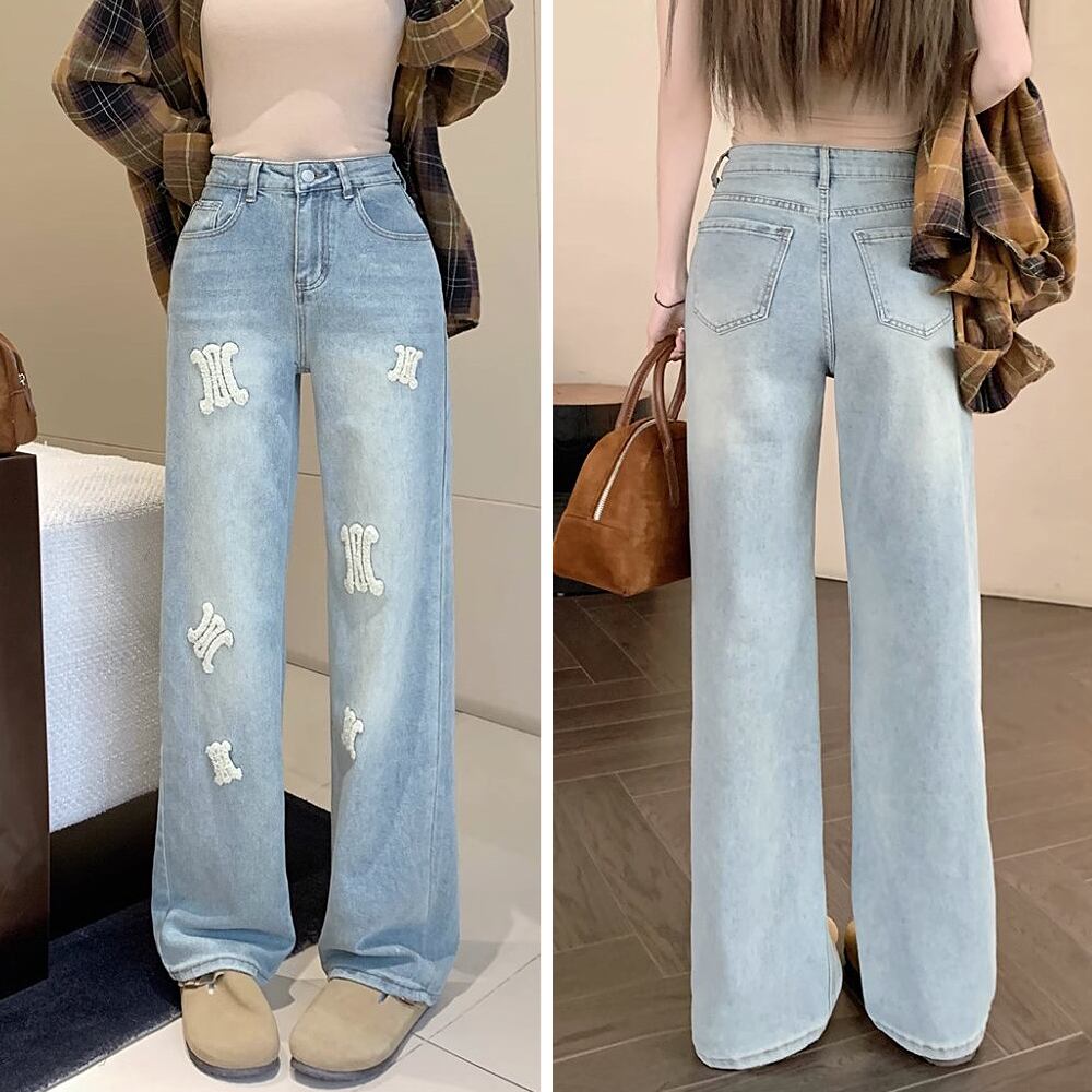 ホワイトパイル刺繍ロングデニムパンツ ハイウエスト ワイドルーズデニム ロゴ刺繍 刺繍 ワイド ワイドレッグ 体型カバー ストリート かわいい 大人可愛い ジーパン カジュアル 大人 おしゃれ お洒落 かっこいい 大人可愛い 大人女子 こなれ感 ラフ ラブリー キュート ガーリー 個性的 レディース 学生 通学 デート お出かけ 公園デビュー 女子会 休日 リゾート 旅行 韓国コーデ 韓国ファッション 韓国コーデ 韓国ファッション 白