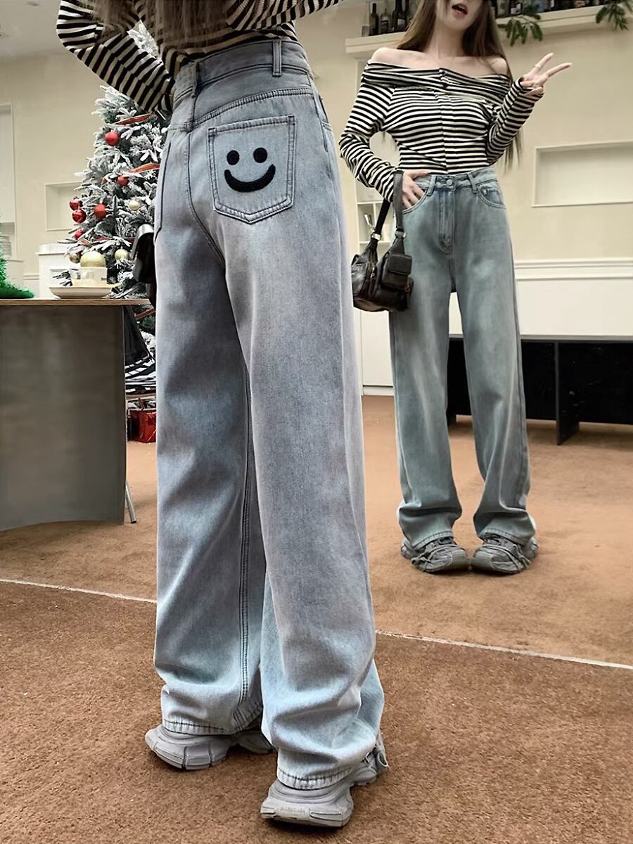 スマイリーフェイスポケットロングワイドデニム パンツ ハイウエスト ニコちゃんマーク ニコちゃん ワイドルーズデニム ワイドレッグ 体型カバー ストリート ヒップマーク かわいい 大人可愛い ジーパン カジュアル 大人 おしゃれ お洒落 かっこいい 大人可愛い 大人女子 こなれ感 ラフ ラブリー キュート ガーリー 個性的 レディース 学生 通学 デート お出かけ 公園デビュー 女子会 休日 リゾート 旅行 韓国コーデ 韓国ファッション