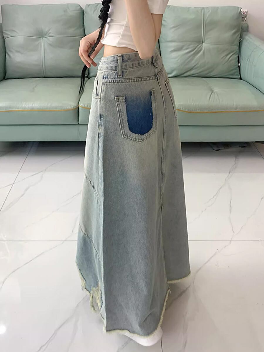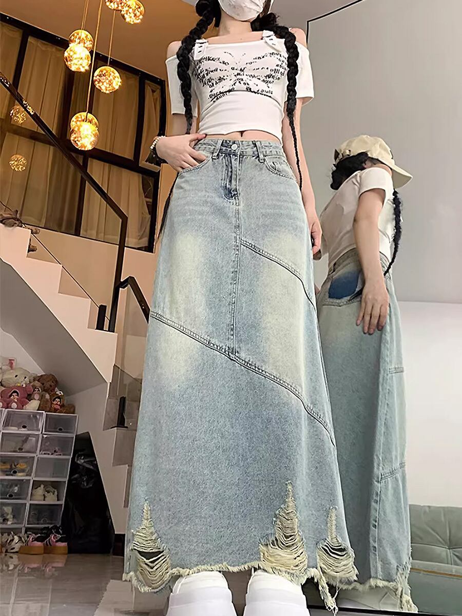 デニムロングフレアスカート 切り替えデザイン 裾ダメージ ダメージデニム 切りっぱなし スリット タッセル フリンジ フリンジ カットオフデニム カットオフ ビンテージ ヴィンテージ フレイドヘムデニム ウォッシャー加工 アメリカンレトロ ハイウエスト ロングスカート オフコーデ 足さばき楽ちん 大人可愛い きれいめ カジュアル かっこいい レトロ 大人可愛い こなれ感 ラフ キュート ガーリー レディース 学生 デート 体系カバー 韓国ファッション ライトブルー 青