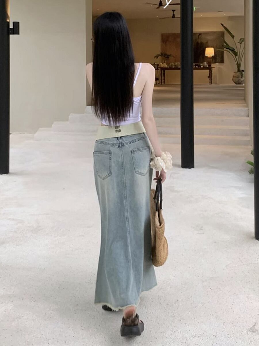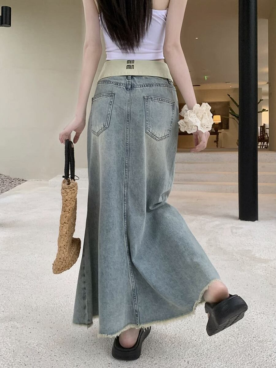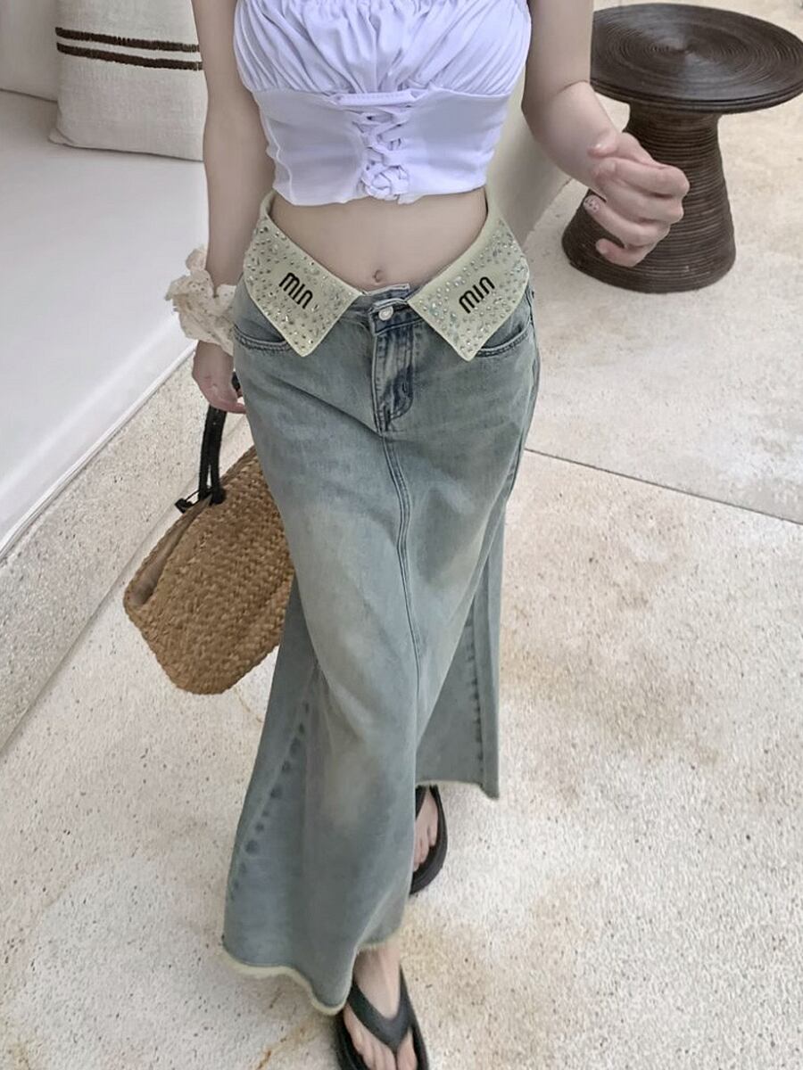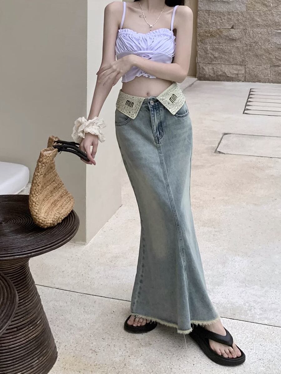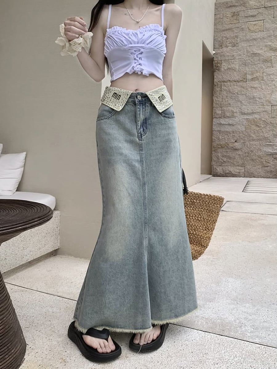 ハイウエストラインストーンマーメイドデニムロングフレアスカート マーメイドライン マーメイドスカート ラインストーン キラキラ ハイウエスト ロングスカート ウォッシュ加工 ダメージ加工 ヴィンテージ ビンテージ ロゴ 大人可愛い きれいめ カジュアル かっこいい レトロ 大人可愛い 大人コーデ こなれ感 ラフ キュート ガーリー レディース 学生 デート リゾート 旅行 体系カバー 韓国コーデ 韓国ファッション ブルー ライトブルー 春 夏