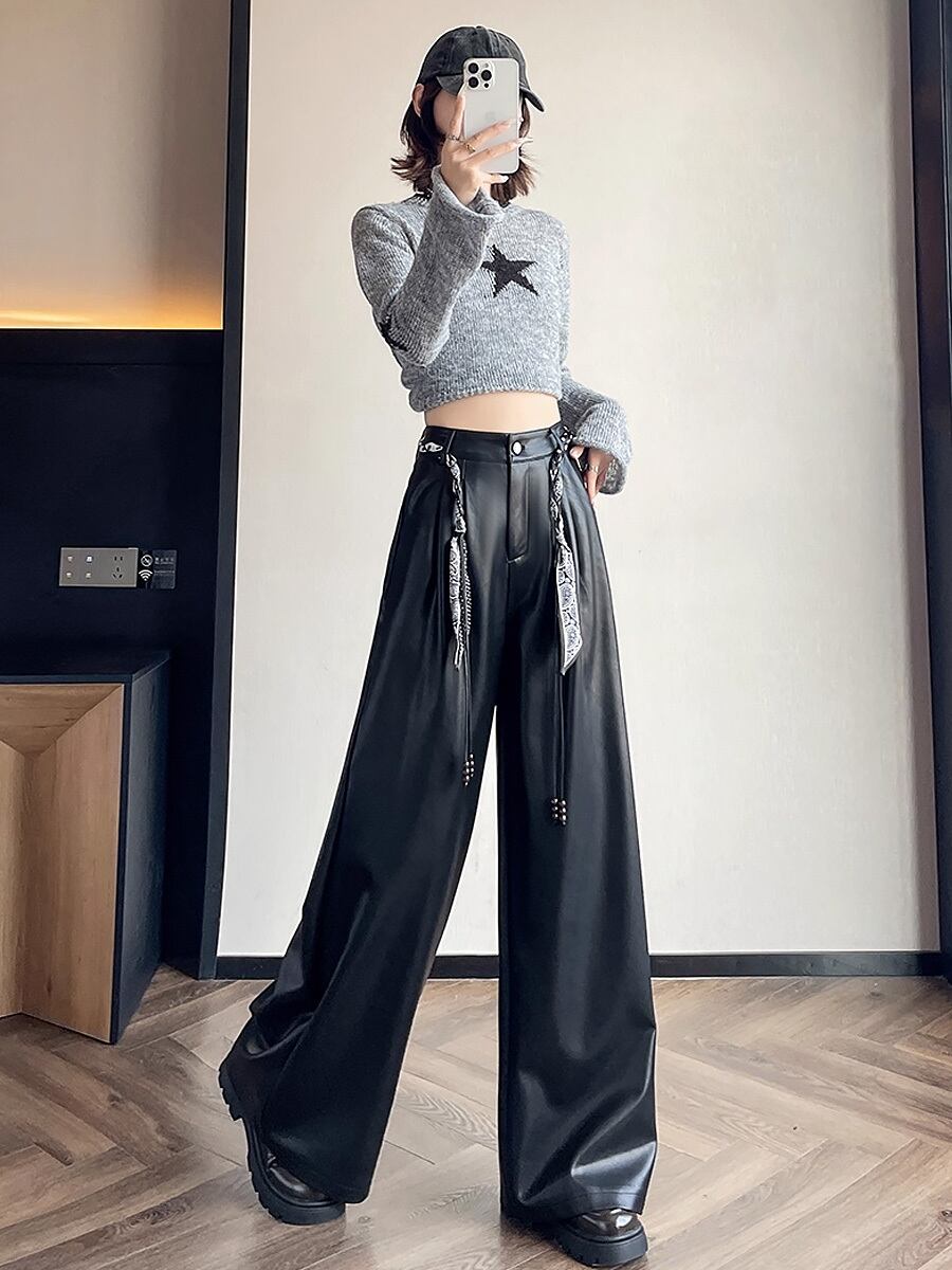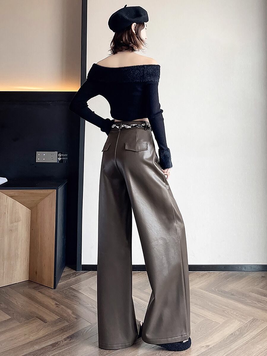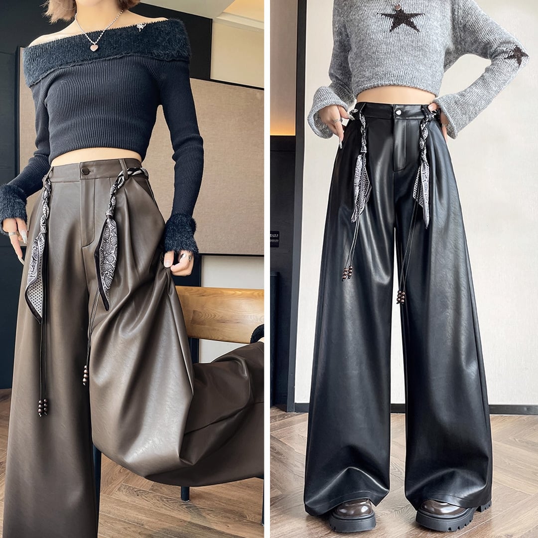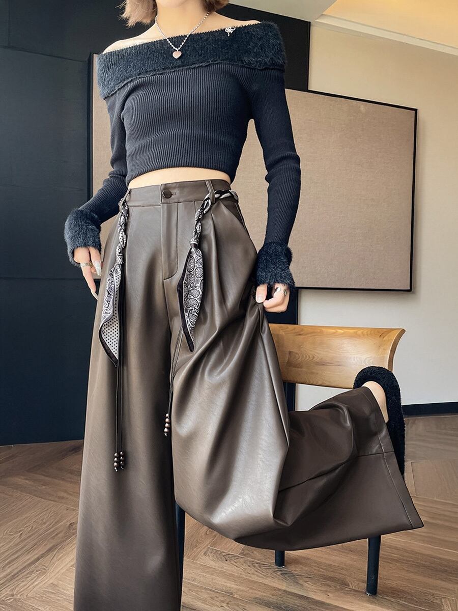 全2色 長さ2種類 スカーフベルト付きPUレザーロングパンツ フェイクレザー ワイド あったか 秋冬 幅広 ロングサイズ 高身長 ハイウエスト スカート ベルト付き スカーフベルト おしゃれベルト かわいい セクシー 大人可愛い きれいめ シンプル カジュアル 上品 おしゃれ かっこいい レトロ こなれ感 ラブリー キュート 楽ちん 個性的 モード系 エレガント モダン 主役級 存在感 抜け感 柄 レディース 着回し お出かけ 韓国コーデ 韓国ファション 黒 ブラック 茶色 ブラウン