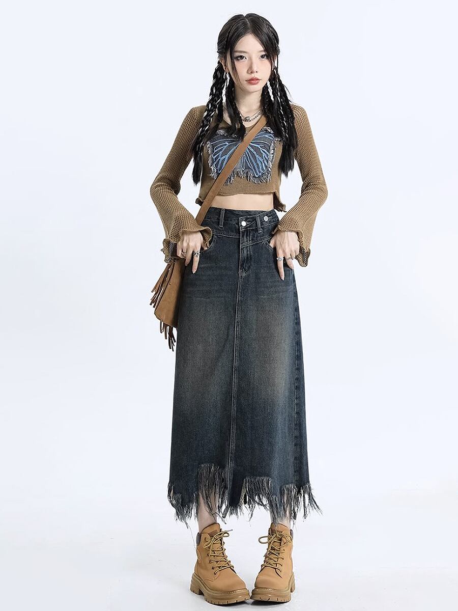 ランダムカットオフデニムフリンジスカート デニムブルー 青 スカート フレアスカート デニムスカート 膝下 ミモレ ミモレ丈 ロング ロング丈 裾フリンジ 房飾り 切りっぱなし カットオフ デニム カラーデニム フリンジ ダメージ カットオフ かわいい 大人可愛い きれいめ シンプル おしゃれ かっこいい レトロ こなれ感 ラブリー キュート ガーリー 個性的 主役級 存在感 抜け感 オールシーズン レディース 着回し 普段使い 韓国コーデ 韓国ファッション