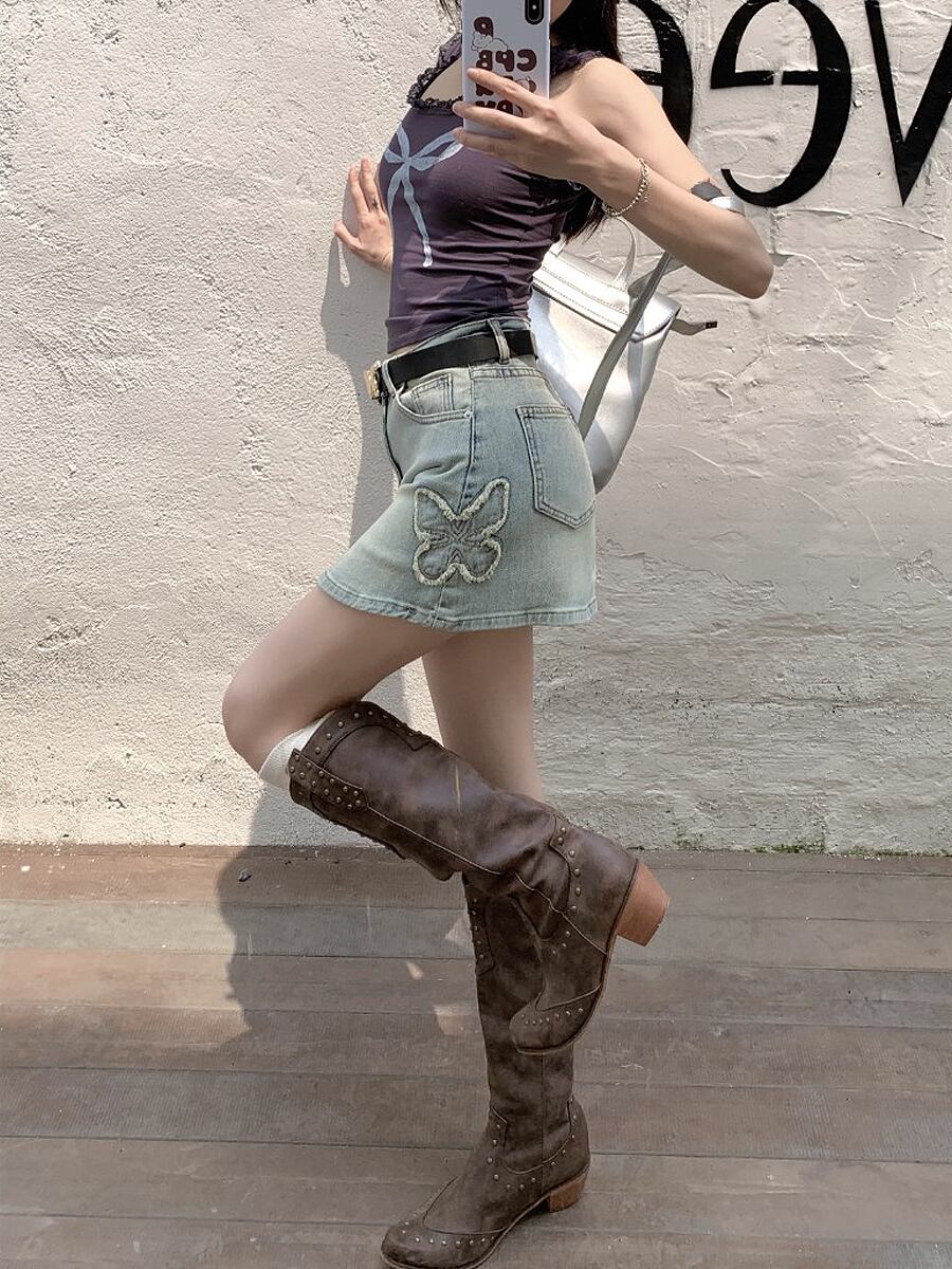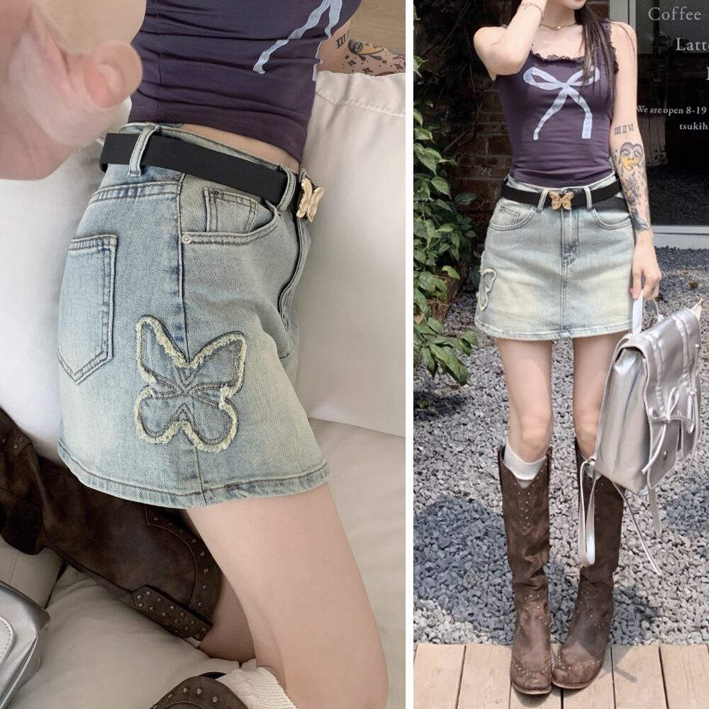 サイド蝶々柄刺繍デニムミニスカート 蝶柄 バタフライ 蝶々 ライトブルー ブルー ミニスカート フレアスカート デニムスカート インナーパンツ付き ペチパンツ キュロットスカート サイド刺繍 横刺繍 脇刺繍 デニム ダメージ加工 ウォッシュ加工 かわいい 大人可愛い きれいめ シンプル おしゃれ かっこいい レトロ こなれ感 ラブリー キュート ガーリー 個性的 主役級 存在感 抜け感 オールシーズン レディース 着回し 普段使い 韓国コーデ 韓国ファッション