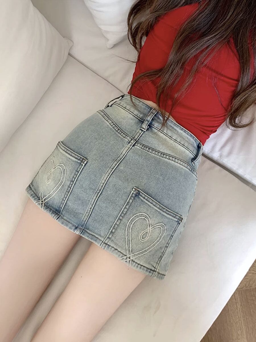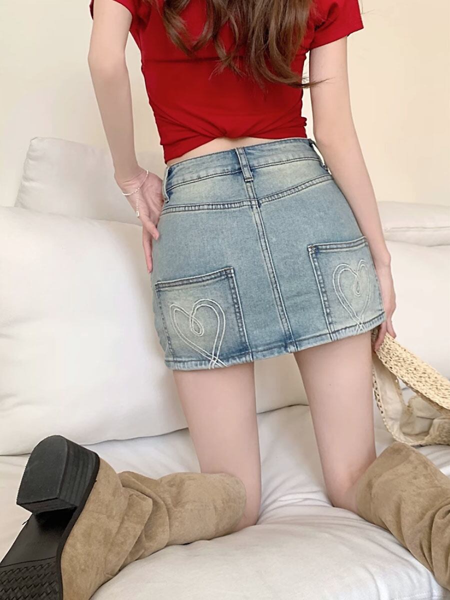 後ろのポケットにハート型にステッチがされたデニムのミニスカートです。