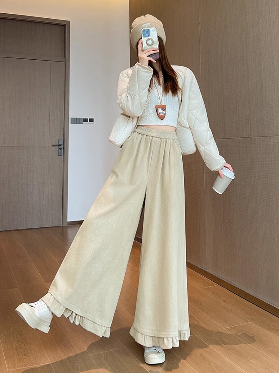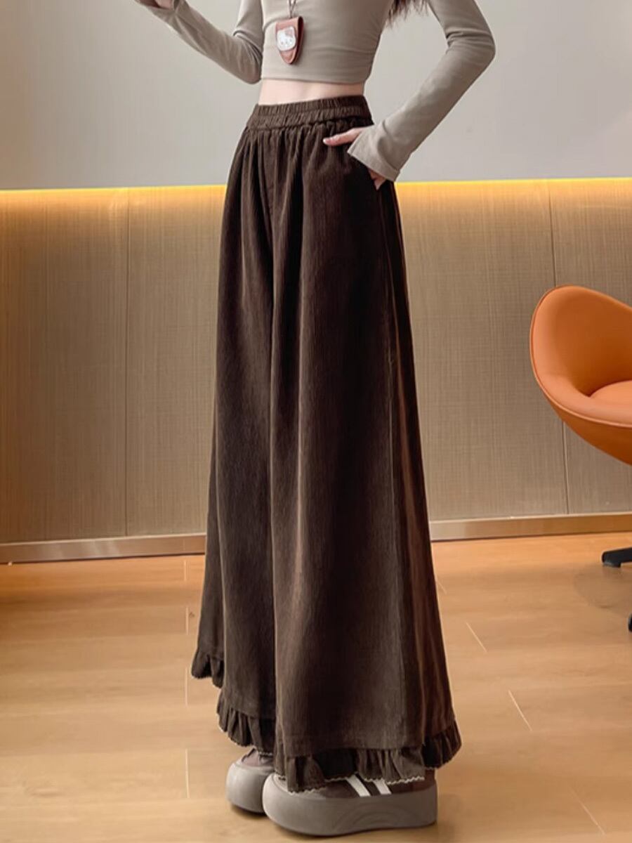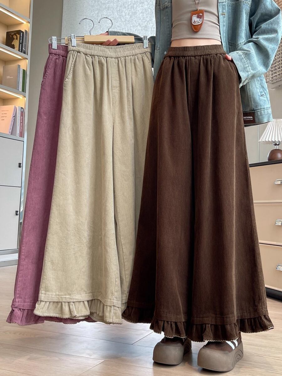 全3色 裾フリルコーディロイパンツ ワイド 楽ちん ロングパンツ 秋冬 ウエストゴム ハイウエスト ワイドパンツ フレアパンツ ルーズパンツ ピンク 茶色 ブラウン アイボリー アプリコット オフホワイト ベロア ベルベット 起毛布 コーディロイ ウエスト楽ちん ミモレ ロング ワイドレッグ ふんわり 秋冬 かわいい 大人可愛い きれいめ シンプル カジュアル おしゃれ レトロ 大人女子 こなれ感 キュート 主役級 存在感 抜け感 レディース 着回し 普段使い モテ インスタ映え