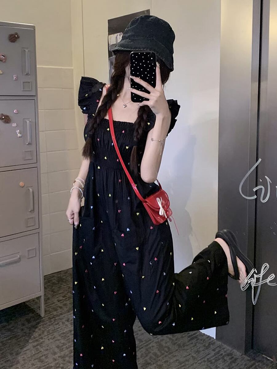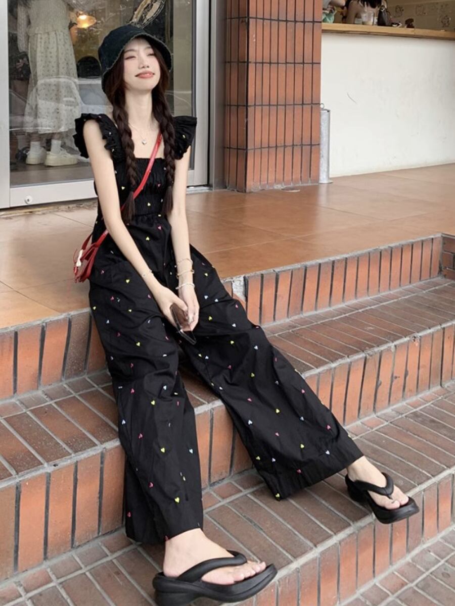 ミニハート型刺繍オールインワン ブラック 黒 ロング 肩フリル オールインワン フレアパンツ サロペット ジャンプスーツ オーバーオール ワイドパンツ リラックス かわいい 大人可愛い きれいめ シンプル カジュアル 大人 おしゃれ かっこいい 大人女子 ラフ キュート ルーズ モード系 抜け感 無地 春 夏 レディース デート お出かけ 旅行 海 プール 普段使い 楽ちん モテ 美脚 脚長 韓国コーデ 韓国ファッション カラフル ハート ミニハート