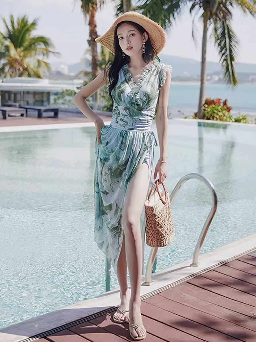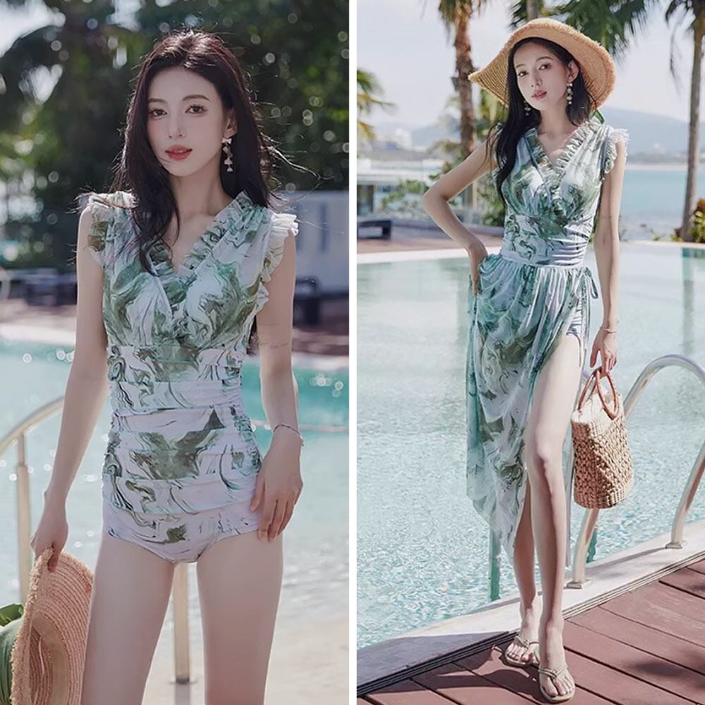 2点セット 水着 マーブル模様Vネックワンピース水着+ロングパレオ ロングスカート グリーン 緑 深緑 サイドリボン フリル ボーイレッグ 露出控えめ 露出少なめ スイムウェア パッド付き パッド ワイヤーあり 胸盛り 美脚 レトロ モダン フェミニン セクシー 上品 大人 お嬢様 おしゃれ お洒落 女っぽ 個性的 レディース ホテル 温泉 海 ビーチ プール リゾート スタイルアップ 美スタイル 韓国 韓国コーデ 韓国ファッション