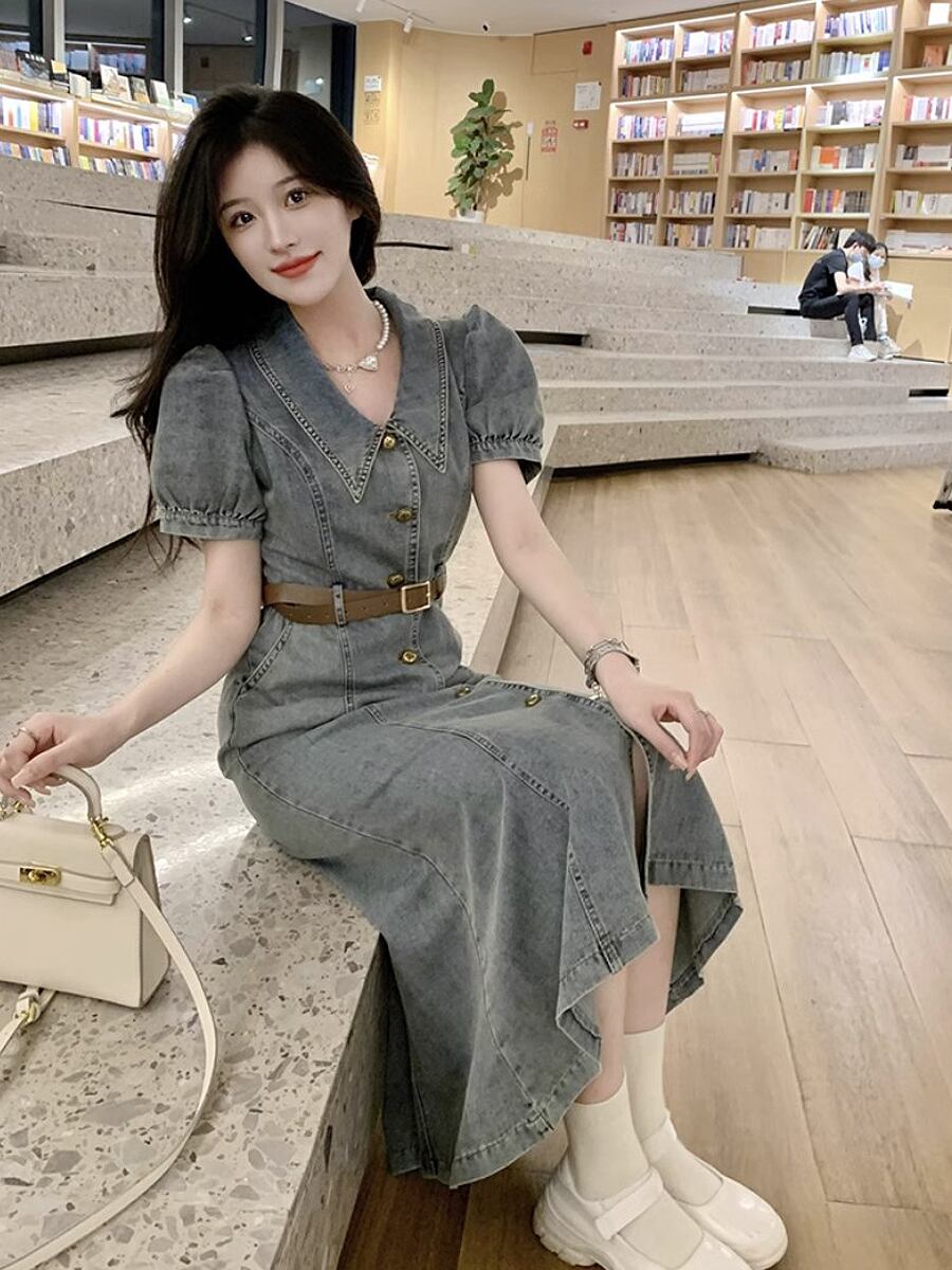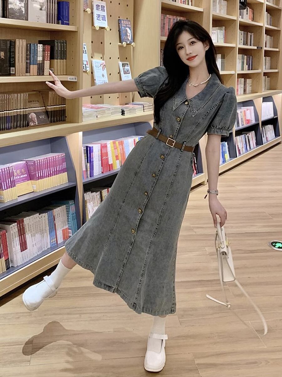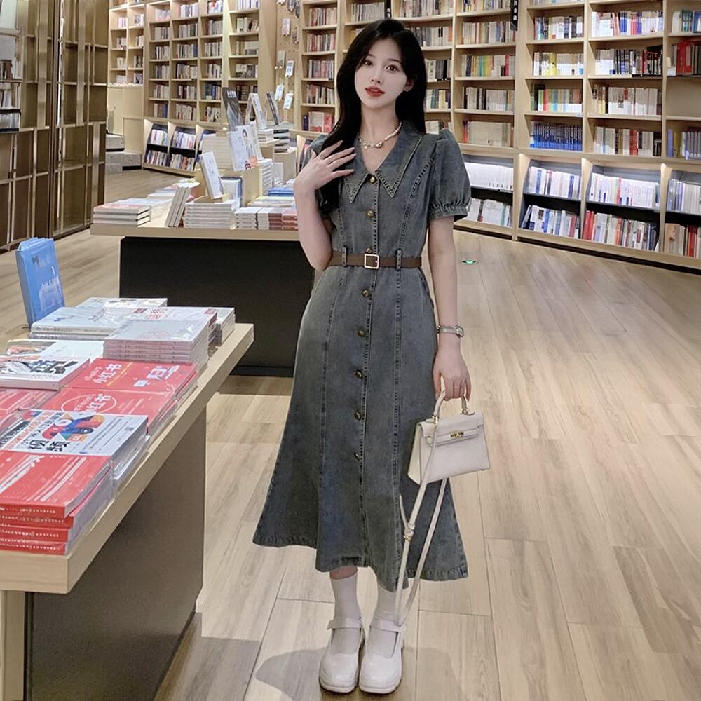 デニムロングワンピースベルト付き デニムワンピ ベルト付き 膝下 ミモレ ロング 袖あり 半袖 萌袖 襟付き Aライン フロントボタン シャツワンピース 切り替えデザイン ベルト ウエストマーク ポケット 前開き デニム 春夏 かわいい 大人可愛い きれいめ シンプル ベーシック おしゃれ お洒落 かっこいい レトロ 大人女子 こなれ感 ラブリー キュート ガーリー 個性的 モード系 エレガント モダン 主役級 存在感 抜け感 韓国コーデ 韓国ファッション 青