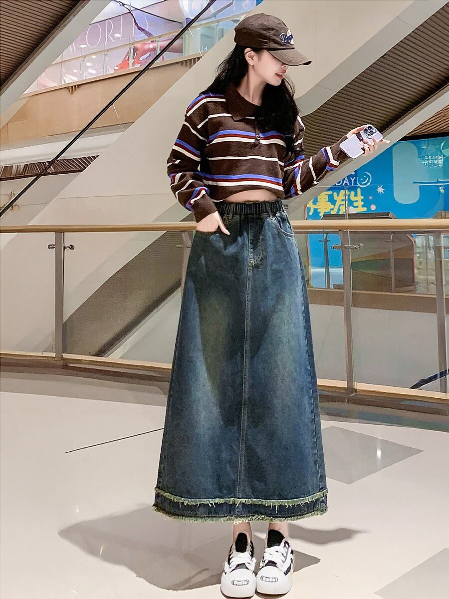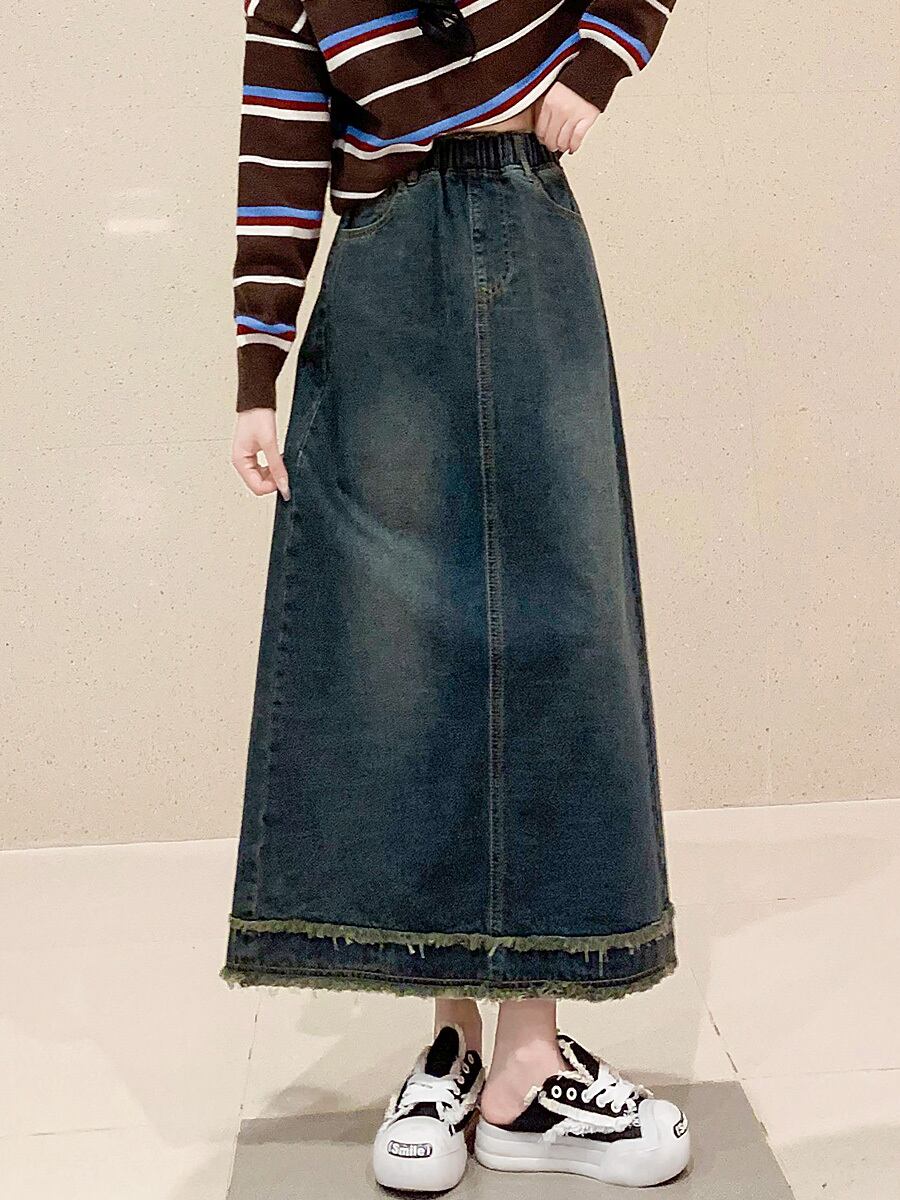 切り替えデザイン裾フリンジデニムロングスカート スリット バックスリット ビンテージ ヴィンテージ セミフレア ウォッシャー加工 スリット深め ハイウエスト ロングスカート ウエストゴム ウエストラクラク オフコーデ スリット 足さばき楽ちん 大人可愛い きれいめ カジュアル かっこいい レトロ 大人可愛い 大人女子 こなれ感 ラフ キュート ガーリー 個性的 レディース 学生 通学 デート お出かけ 公園デビュー リゾート 旅行 体系カバー 韓国コーデ ブルー 青