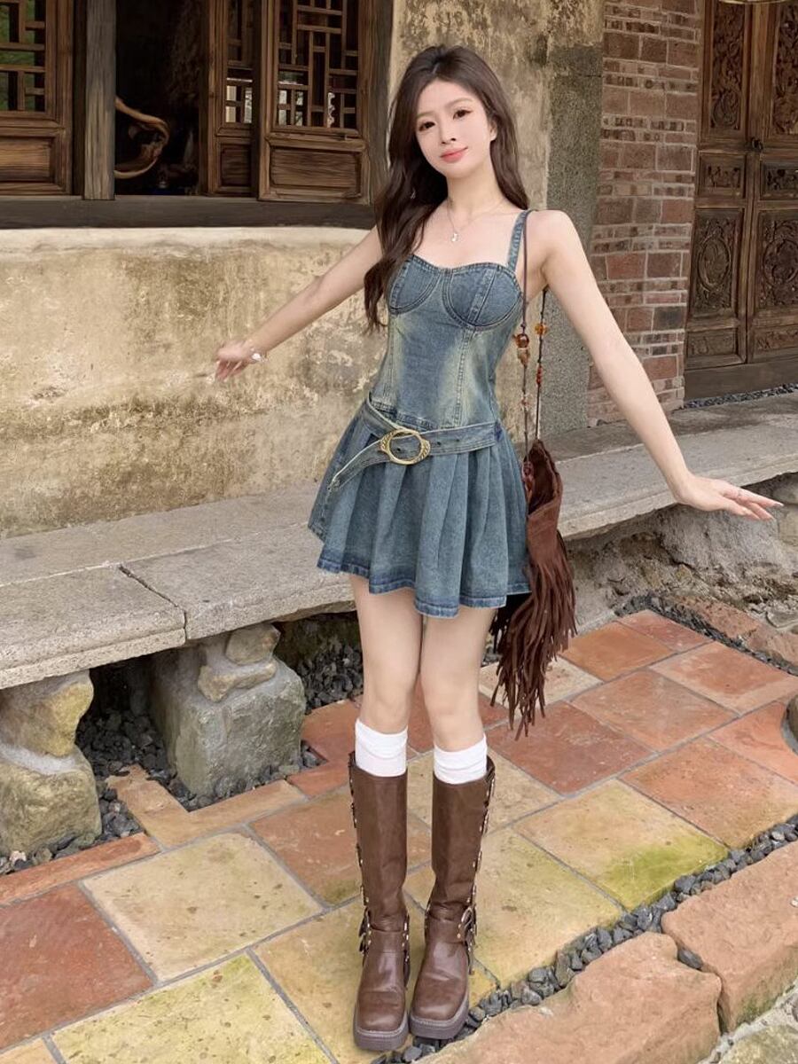 デニムミニキャミソールミニワンピースベルト付き デニムワンピ 共布ベルト付き デニム 膝上 ショート丈 ミニ キャミワンピ フレア 切り替えデザイン ベルト ウエストマーク デニム 春夏 かわいい 大人可愛い きれいめ シンプル ベーシック おしゃれ お洒落 かっこいい レトロ 大人女子 こなれ感 ラブリー キュート ガーリー 個性的 モード系 エレガント モダン 主役級 存在感 抜け感 韓国コーデ 韓国ファッション 青 ブルー