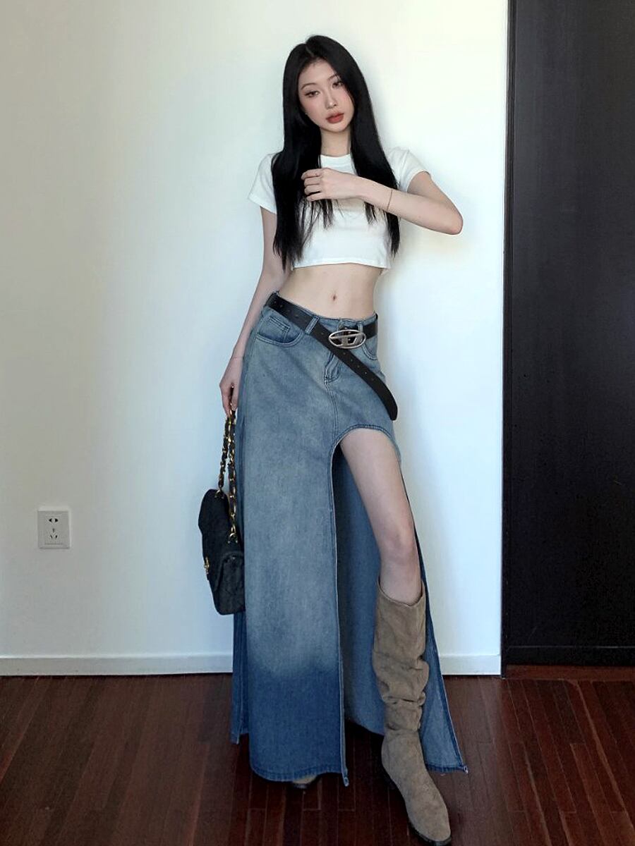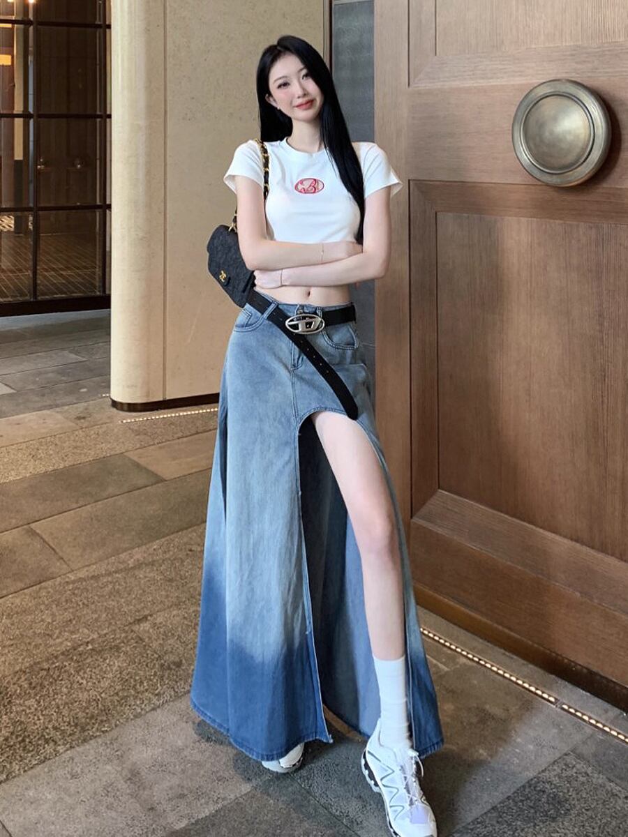 アシンメトリーダブルスリットロングデニムスカート スリット ダブルスリット マキシ丈 マキシ デニム 切り替えデザイン 斜め合わせウエスト 深めスリット アシンメトリー スリット ウォッシュ加工 グラデーション デニム 春夏 かわいい 大人可愛い きれいめ シンプル ベーシック おしゃれ お洒落 かっこいい レトロ 大人女子 こなれ感 ラブリー キュート ガーリー 個性的 モード系 エレガント モダン 主役級 存在感 抜け感 韓国コーデ 韓国ファッション 青 ブルー