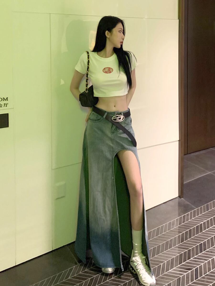 サイドと斜め前に大きくスリットがはいったデニムのロングスカートです。