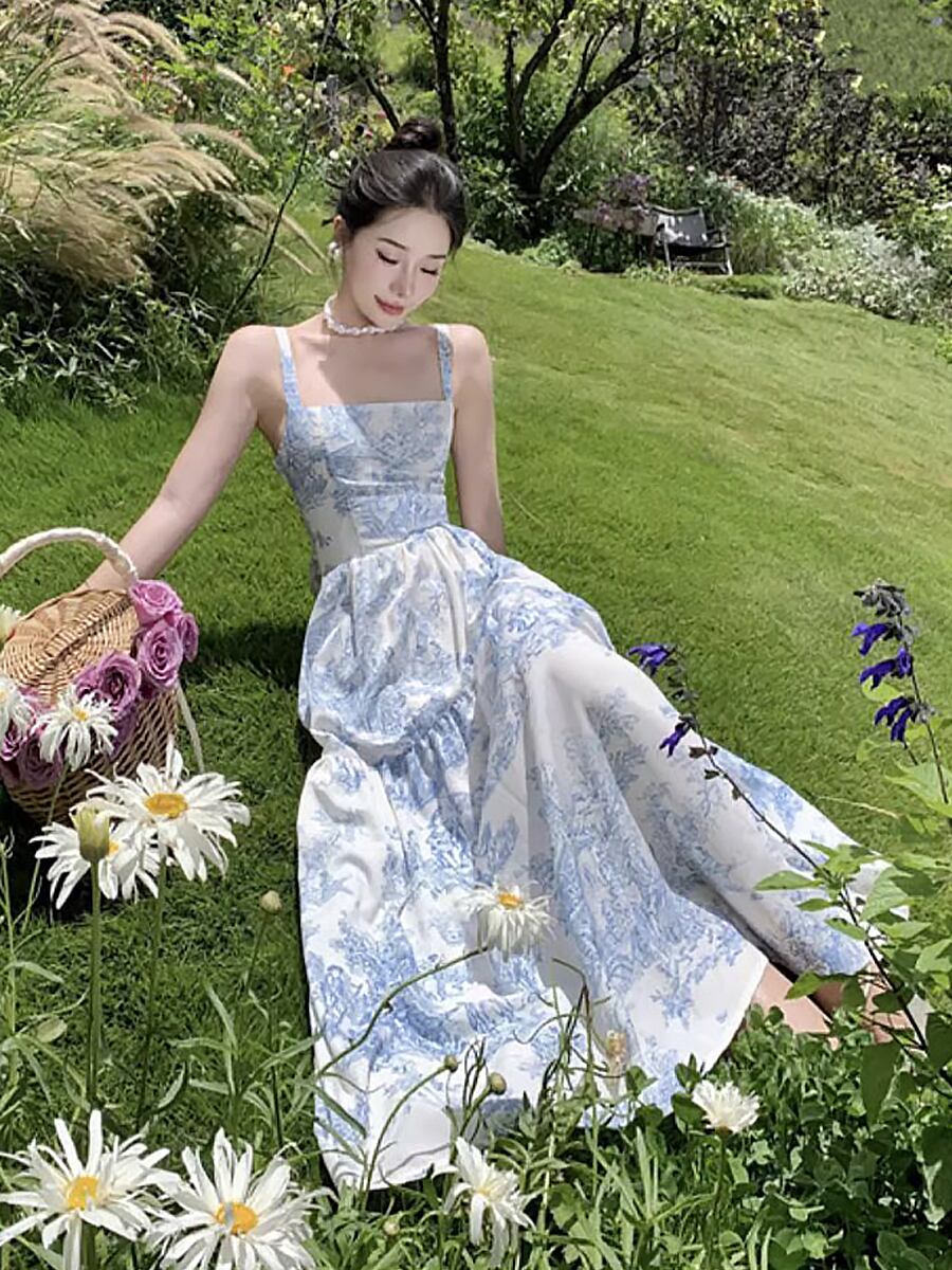 トワルドジュイ柄バックコンシャスワンピース バックリボン 背中見せ 背中ちら見せ キャミソールワンピース キャミワンピ ロング マキシ Aライン ウエストマーク ブルー 青 夏ワンピ サマードレス サマーワンピース 涼しげ かわいい 大人可愛い きれいめ シンプル カジュアル 大人 お洒落 大人女子 こなれ感 ラフ キュート 主役級 存在感 無地 夏 レディース リゾート 旅行 海 プール 着回し 韓国 オルチャン ファッション コーデ 脚長 韓国コーデ 韓国ファッション