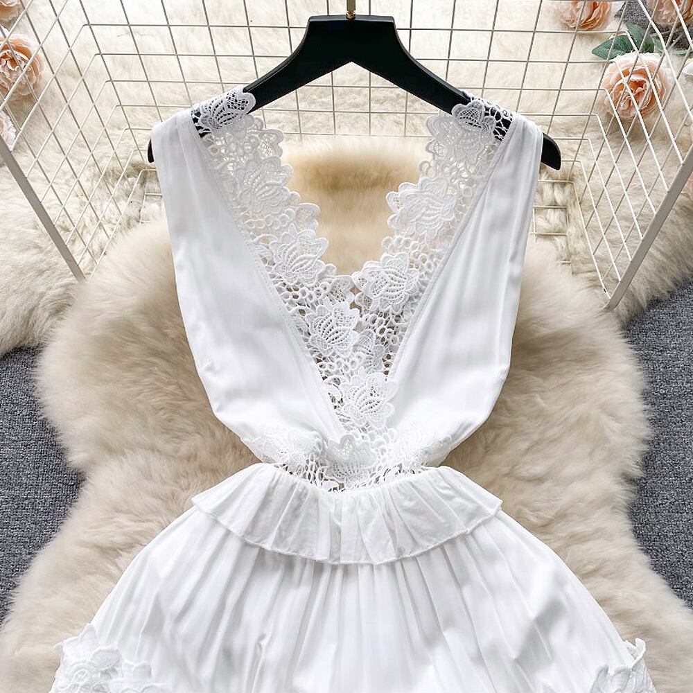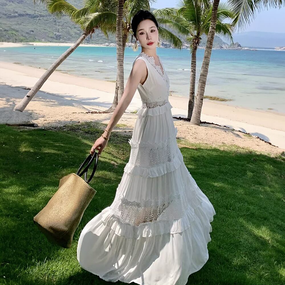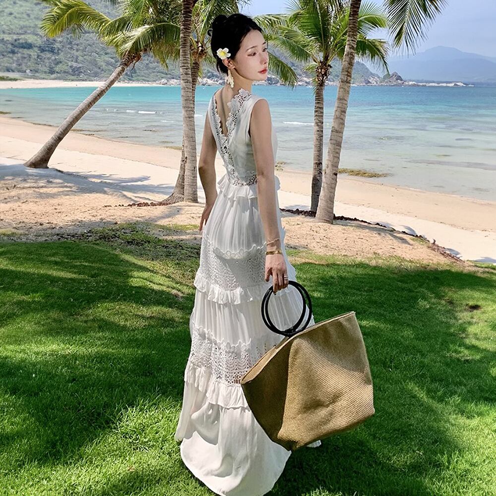 Vネックノースリーブレースロングワンピース ホワイト 白 レース切替え ハイウエスト マキシ丈 ティアード ティアードスカート 透け感 キャミワンピ エンブロイダリーレース バカンスドレス 体系カバー 夏ワンピ 夏 サマーワンピ サマーワンピース サマードレス 夏ドレス かわいい 大人可愛い きれいめ シンプル カジュアル 大人 上品 楽ちん おしゃれ お洒落 大人可愛い 大人女子 こなれ感 ラフ ガーリー 春 夏 レディース 学生 韓国コーデ 韓国ファション