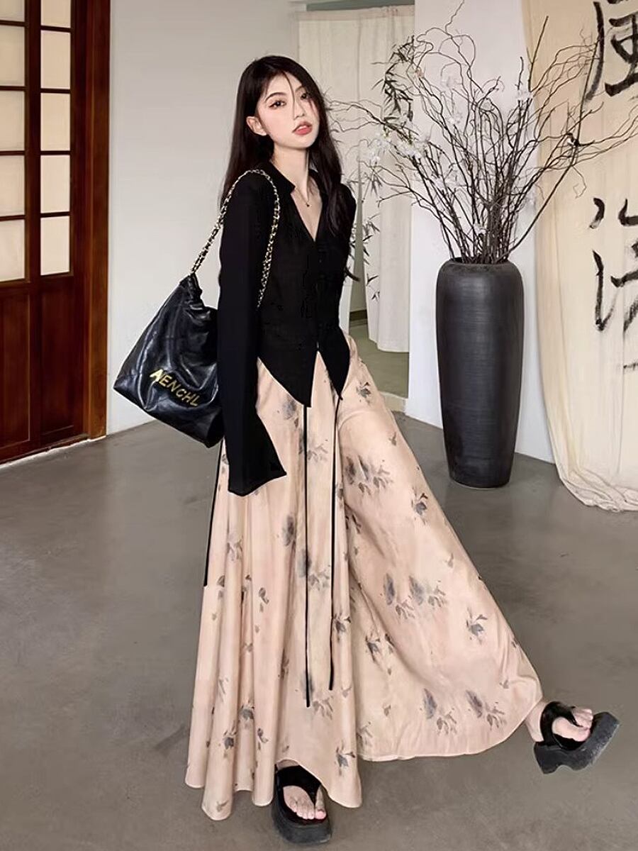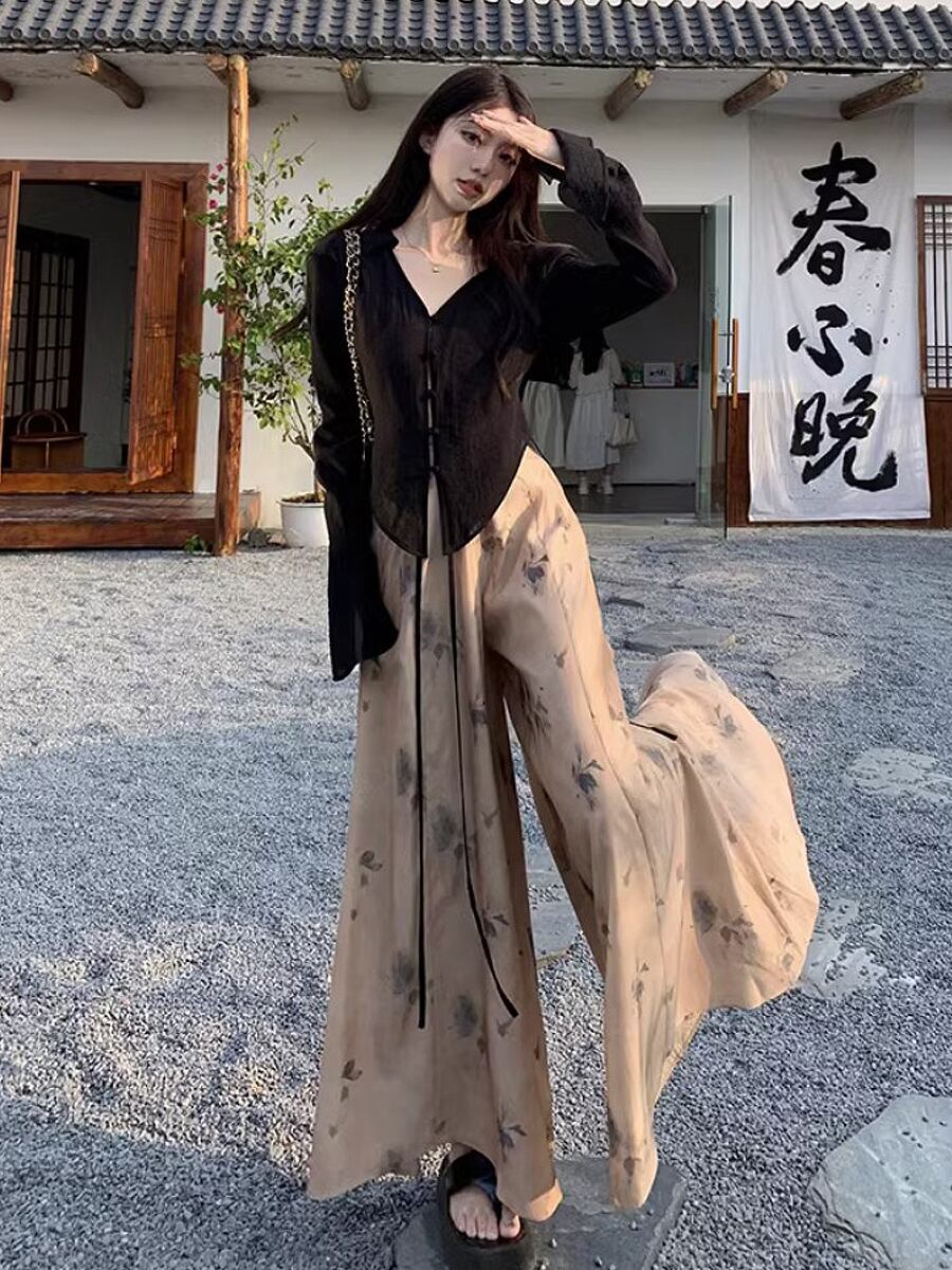 トレンドのくすみカラーの花柄ロングワイドパンツです。