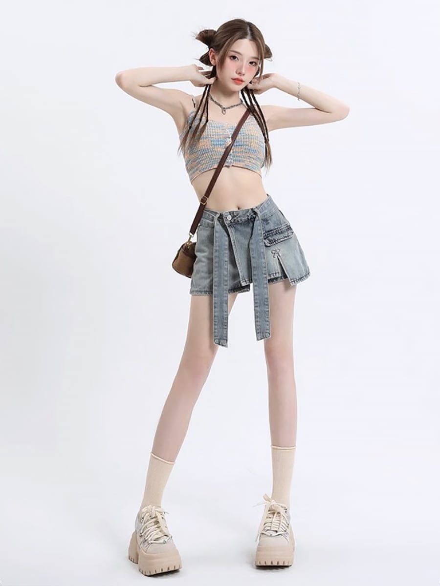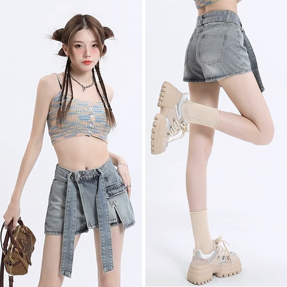 デニムダミーミニスカート ショートパンツ ショーパン ダミースカート ミニスカート ミニ スリム 共布ベルト リボンベルト デニムパンツ ファスナー 前開き 春夏 ウォッシュ加工 かわいい 大人可愛い きれいめ シンプル 上品 おしゃれ お洒落 かっこいい レトロ こなれ感 ラブリー キュート ガーリー 個性的 モード系 モダン 主役級 存在感 抜け感 無地 レディース お出かけ 女子会 休日 着回し 普段使い 韓国 オルチャン韓国コーデ 韓国ファッション ライトブルー
