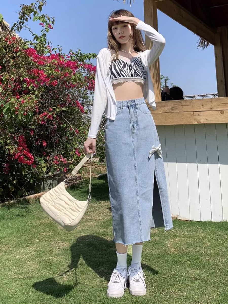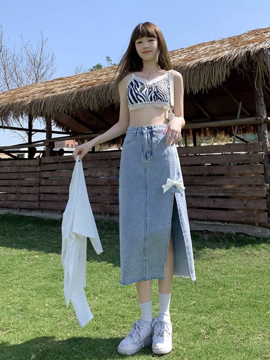 深めのスリットにリボンがついたちょっとセクシーでフェミニンなデニムのロングスカートです。