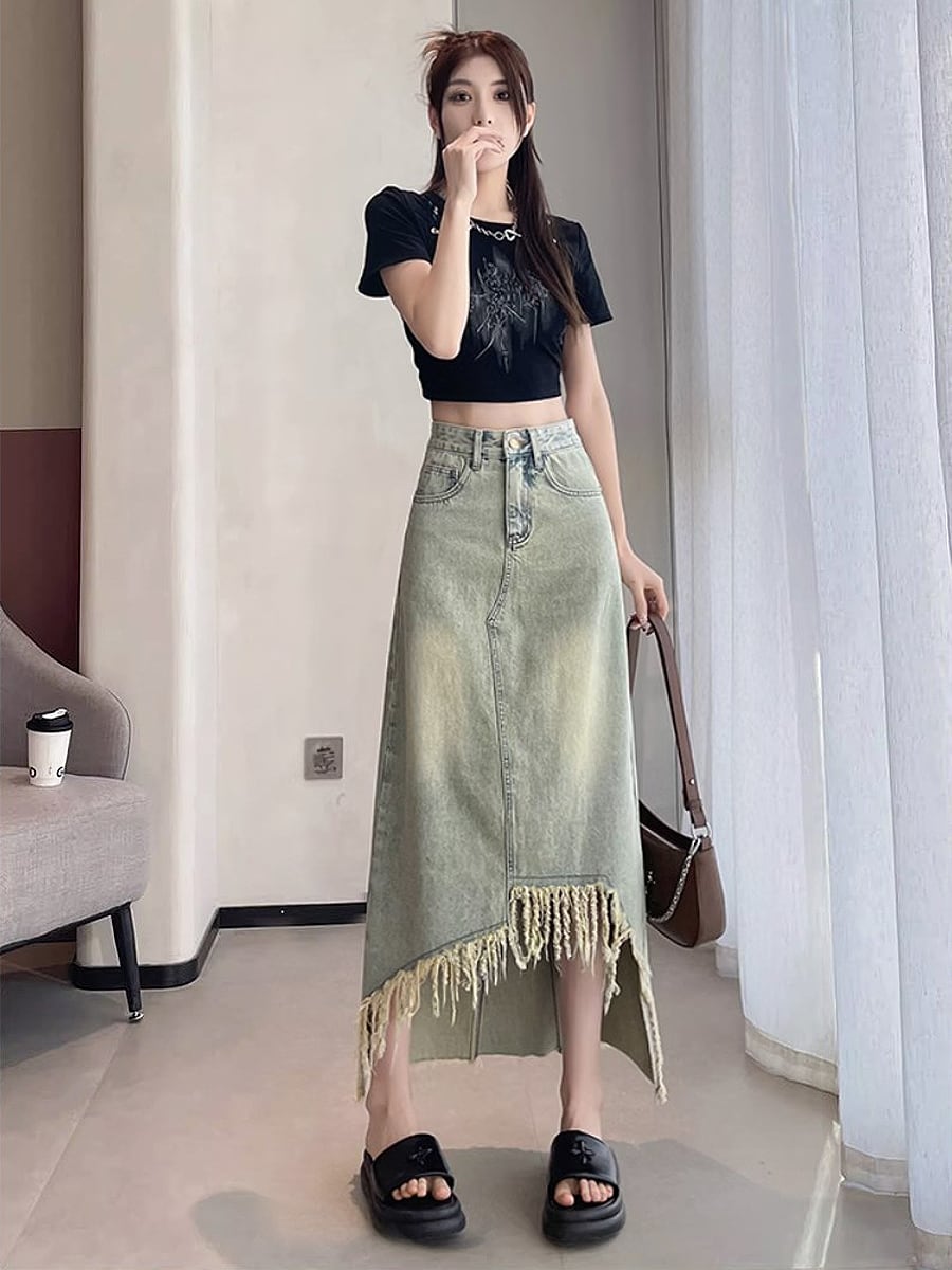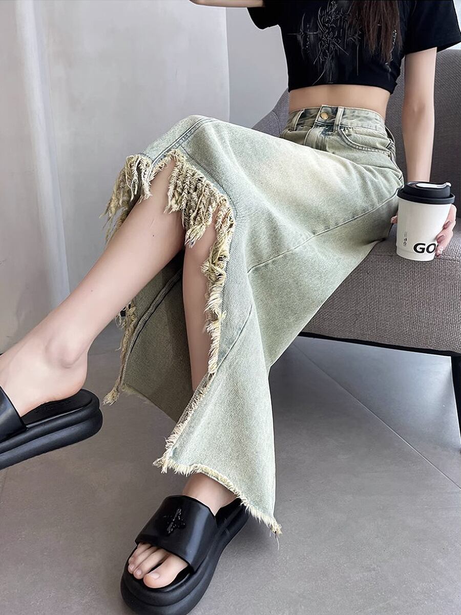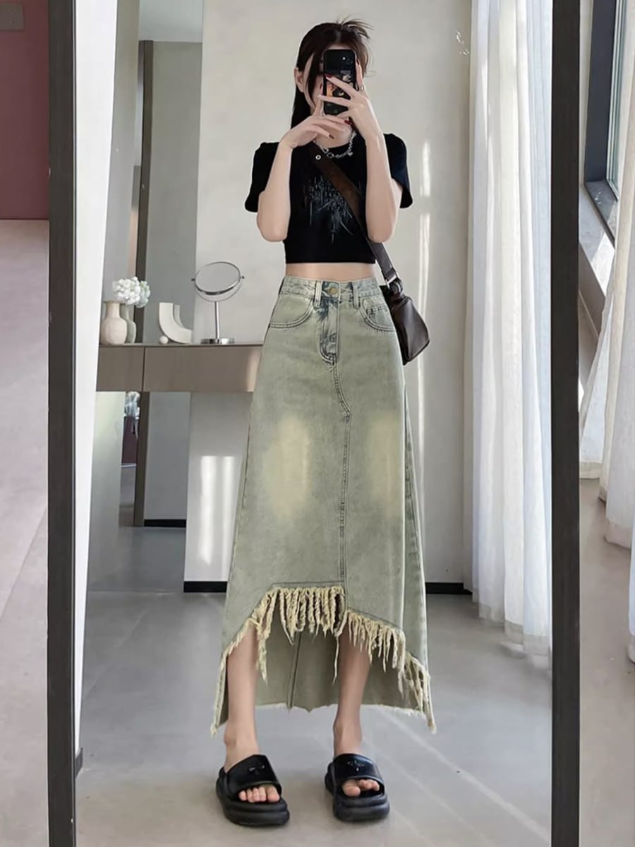 長さ2種類 デニムフロントタッセルロングスカート アシンメトリー タッセル フリンジ 膝下 ダメージデニム デニム ハイウエスト ミドル丈 フロントショート 不規則 レトロ ダメージ加工 かわいい 大人可愛い きれいめ シンプル カジュアル 大人 上品 おしゃれ お洒落 かっこいい 大人可愛い こなれ感 ラフ ラブリー キュート ガーリー 個性的 レディース 通勤 学生 通学 デート お出かけ リゾート 旅行 韓国コーデ 韓国ファション ブルー 青
