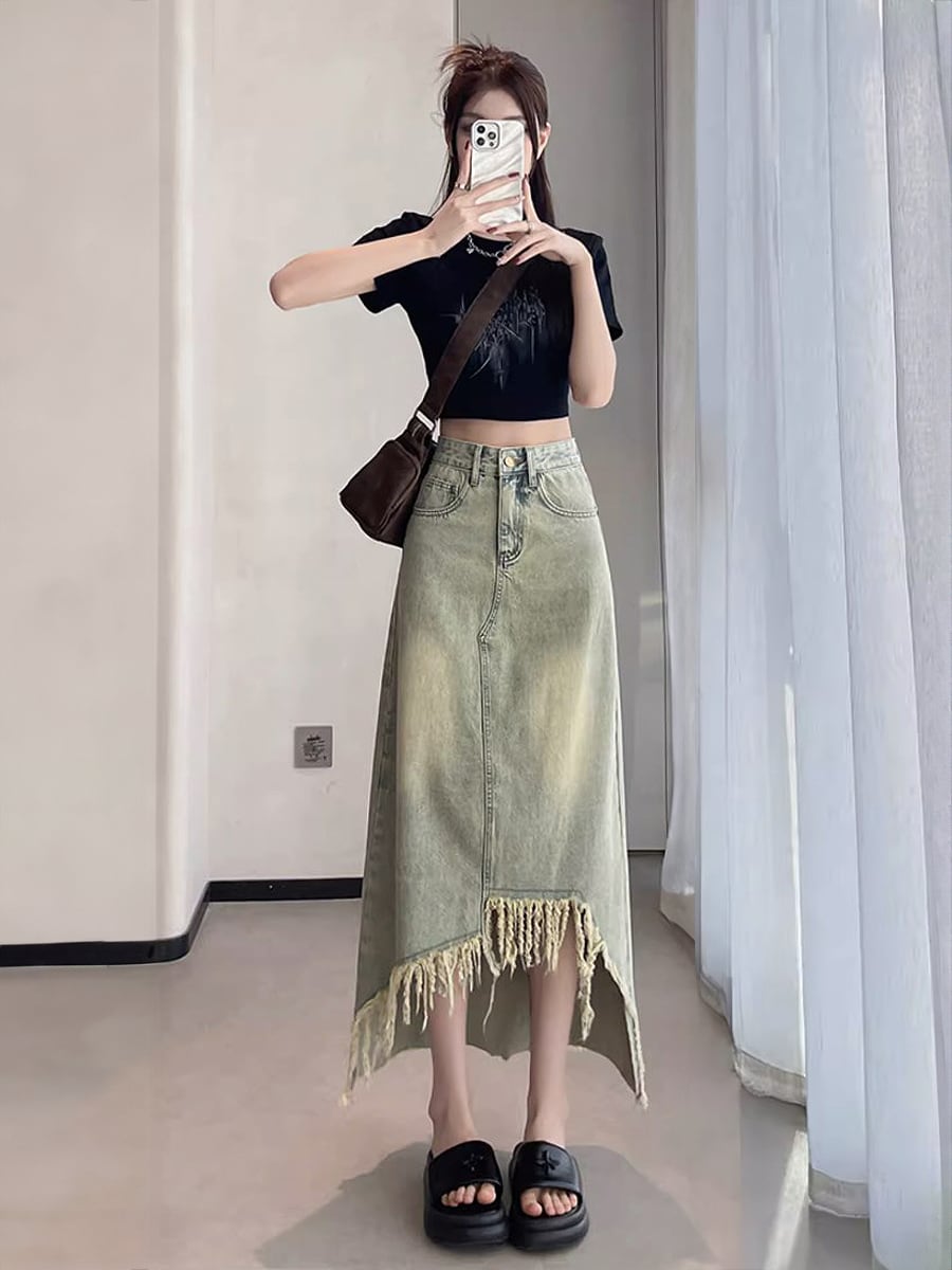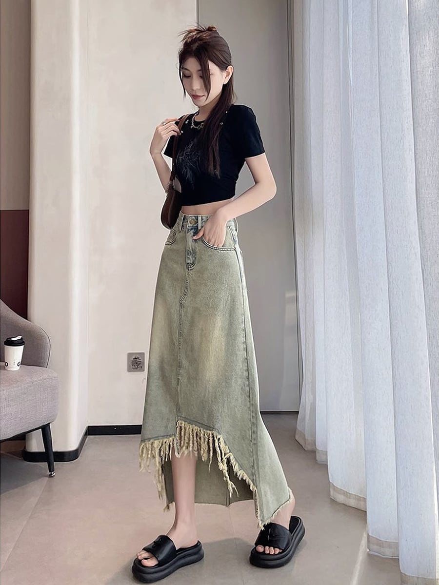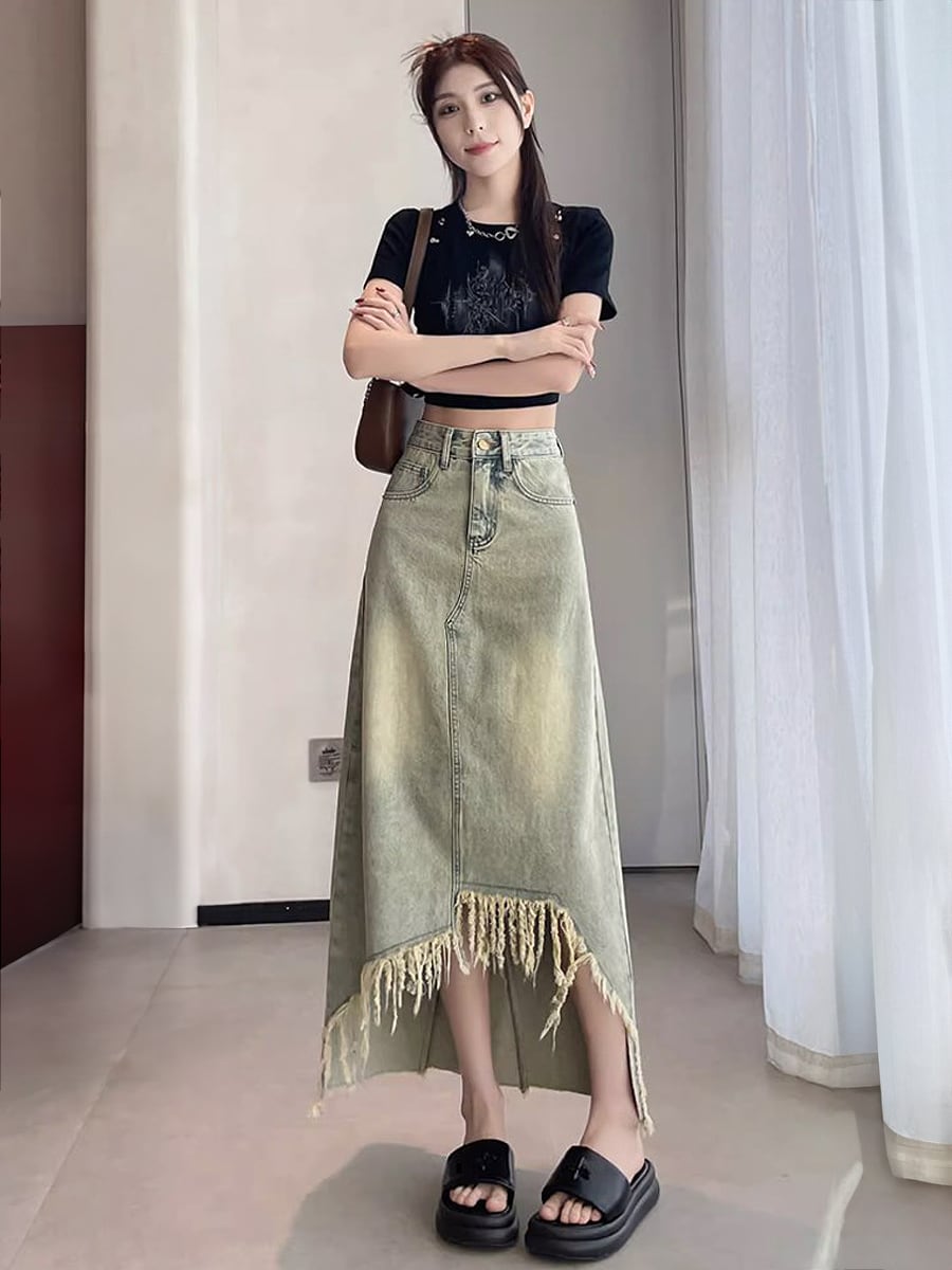 長さ2種類 デニムフロントタッセルロングスカート アシンメトリー タッセル フリンジ 膝下 ダメージデニム デニム ハイウエスト ミドル丈 フロントショート 不規則 レトロ ダメージ加工 かわいい 大人可愛い きれいめ シンプル カジュアル 大人 上品 おしゃれ お洒落 かっこいい 大人可愛い こなれ感 ラフ ラブリー キュート ガーリー 個性的 レディース 通勤 学生 通学 デート お出かけ リゾート 旅行 韓国コーデ 韓国ファション ブルー 青