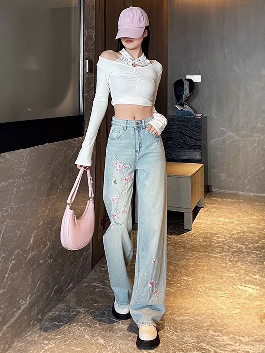 長さ2種類 花柄刺繍デニムロングパンツ 春夏 通気性あり花柄 梅 春夏 刺繍 デニム ハイウエスト ウォッシュ加工 フェミニン かわいい 大人可愛い きれいめ シンプル カジュアル 大人 上品 おしゃれ お洒落 かっこいい 大人可愛い 大人女子 こなれ感 ラフ ラブリー キュート ガーリー 個性的 レディース 通勤 学生 通学 デート お出かけ 公園デビュー リゾート 旅行 韓国コーデ 韓国ファション ブルー 青 ライトブルー