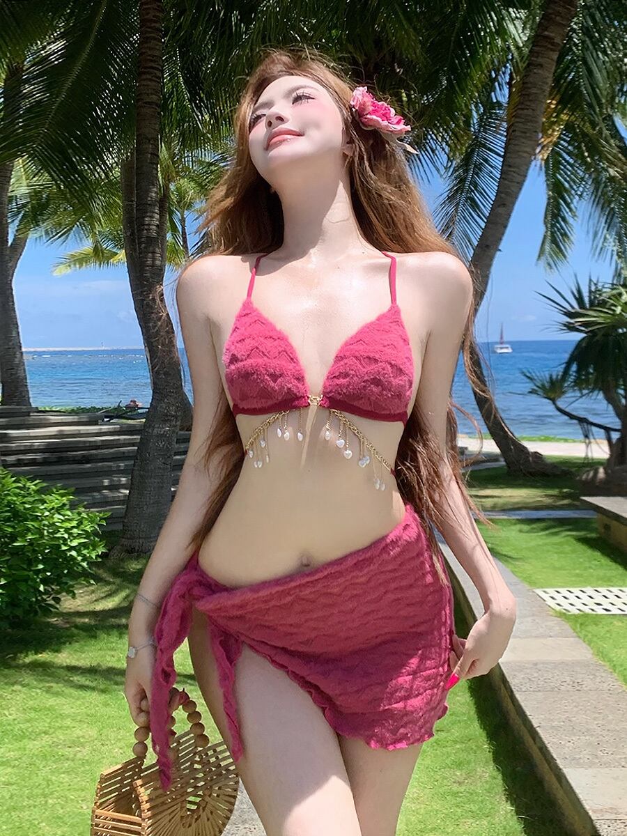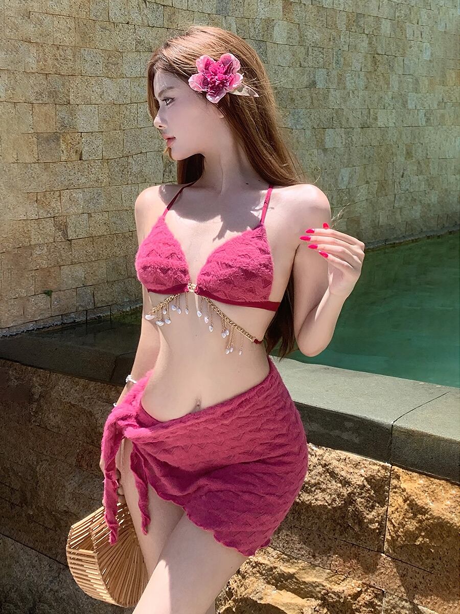 3点セット 水着 ビキニ ボディチェーン付きジャガード織りビキニ上下+パレオ ピンク チェリーピンク マゼンタ フューシャピンク ボディチェーン付き チャーム付きボディチェーン シャラシャラ ボディチェーン風 すっきり さわやか パット付き ワイヤーなし ノンワイヤー かわいい ガーリー 大人可愛い 大人っぽい おしゃれ ラブリー キュート レディース 女の子 海 ビーチ プール リゾート 美脚 脚長 着痩せ 韓国系 オルチャン 韓国ファション 韓国コーデ