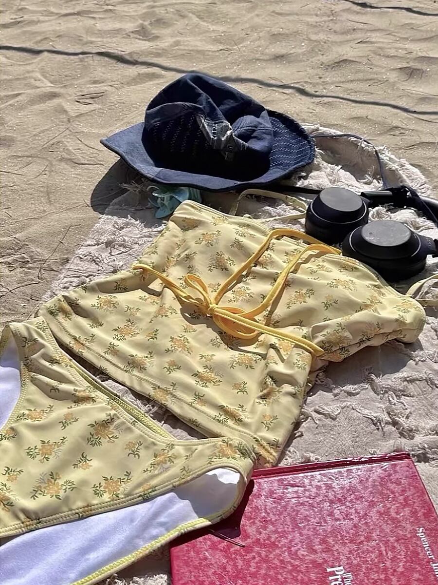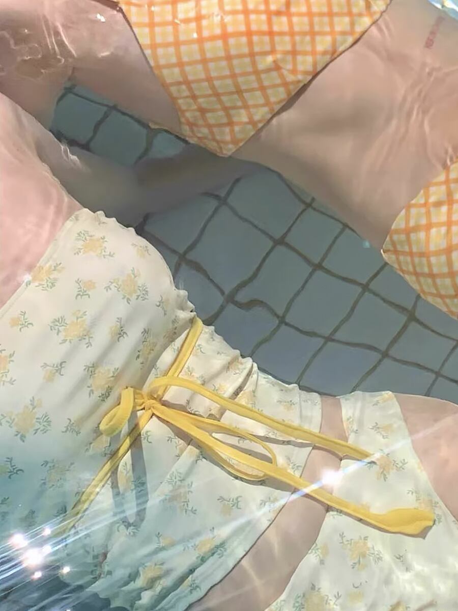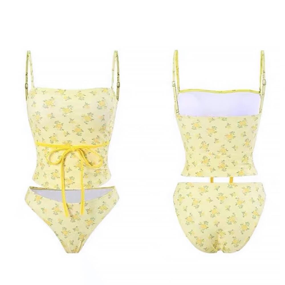 水着 イエロー小花柄ビキニ タンキニ スイムウェア 体系カバー水着 ストラップ取り外し可 セパレート パッド付き ワイヤーなし 体系カバー リボン チューブトップ 胸元カバー 谷間カバー 胸元ボリュームアップ 大人ガーリー かわいい 大人可愛い きれいめ お嬢様 華やか 大人 おしゃれ お洒落 主役級 存在感 女っぽ ラブリー キュート ガーリー スタイリッシュ モダン チェック柄 体系カバー 美脚 脚長 韓国コーデ 韓国ファッション 黄色 イエロー