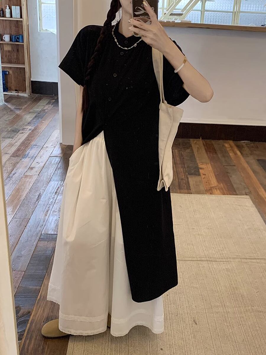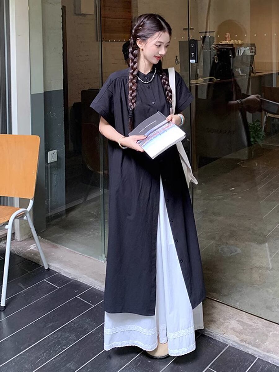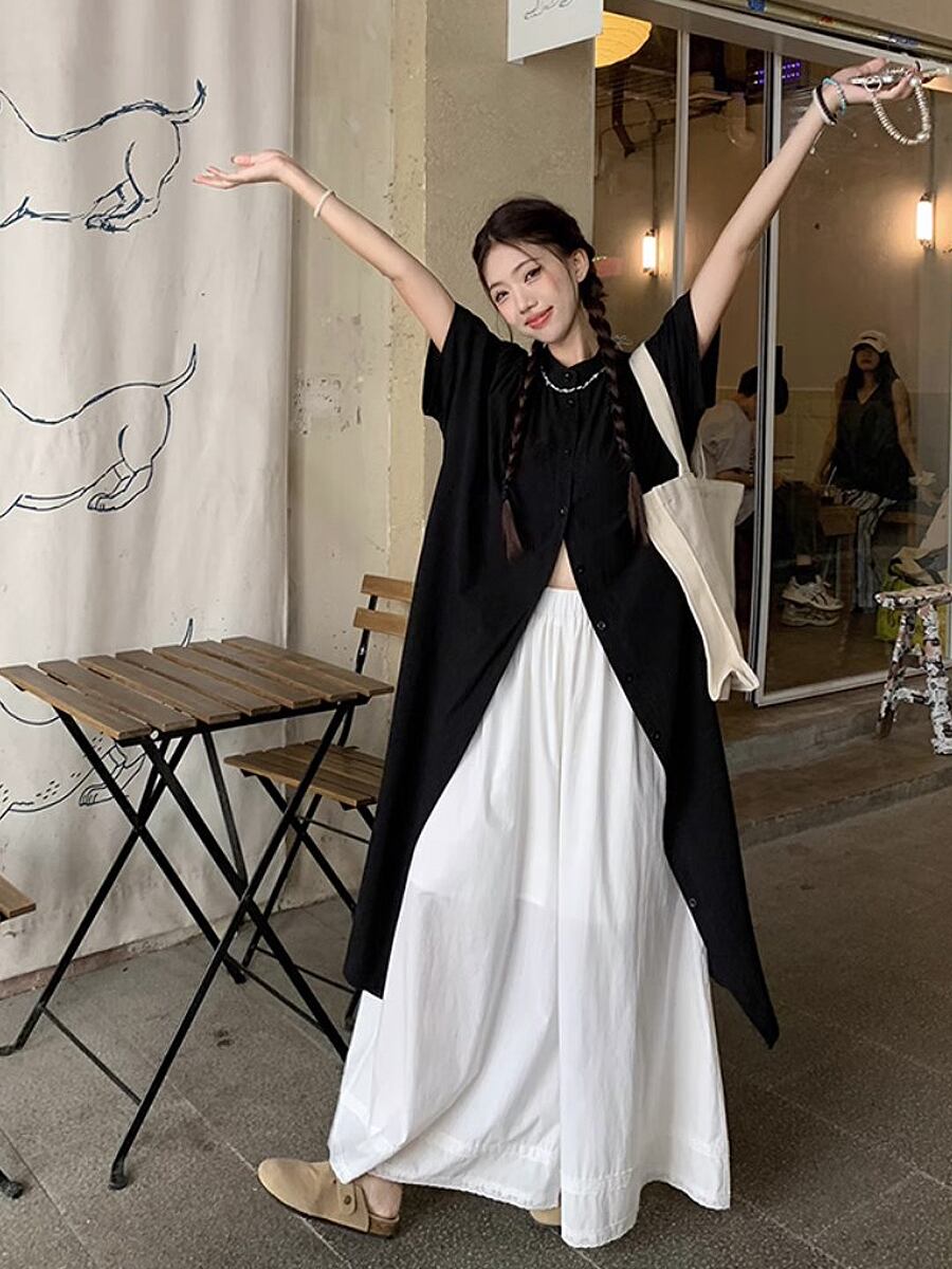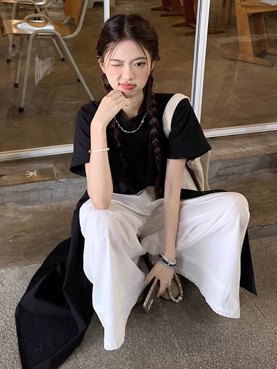 2点セット ブラック半袖ロングシャツブラウス+ホワイトロングフレアパンツ フレンチスリーブ 黒 ブラック 白 ホワイト シャツブラウス 薄め生地 フレアパンツ 襟付き 上着 カーディガン ブラウス セットアップ 冷房対策 襟なし 前ボタン 裾レース かっこいい かわいい 大人可愛い きれいめ シンプル カジュアル 大人 上品 楽ちん おしゃれ お洒落 大人可愛い 大人女子 こなれ感 ラフ ガーリー 春 夏 レディース 学生 韓国コーデ 韓国ファション