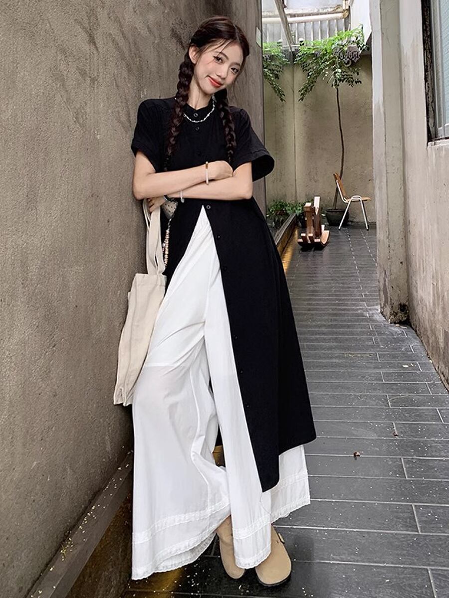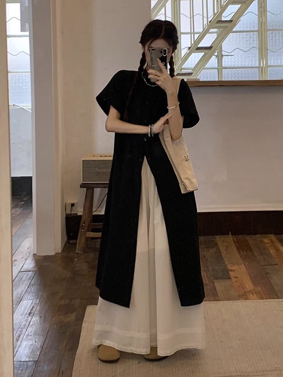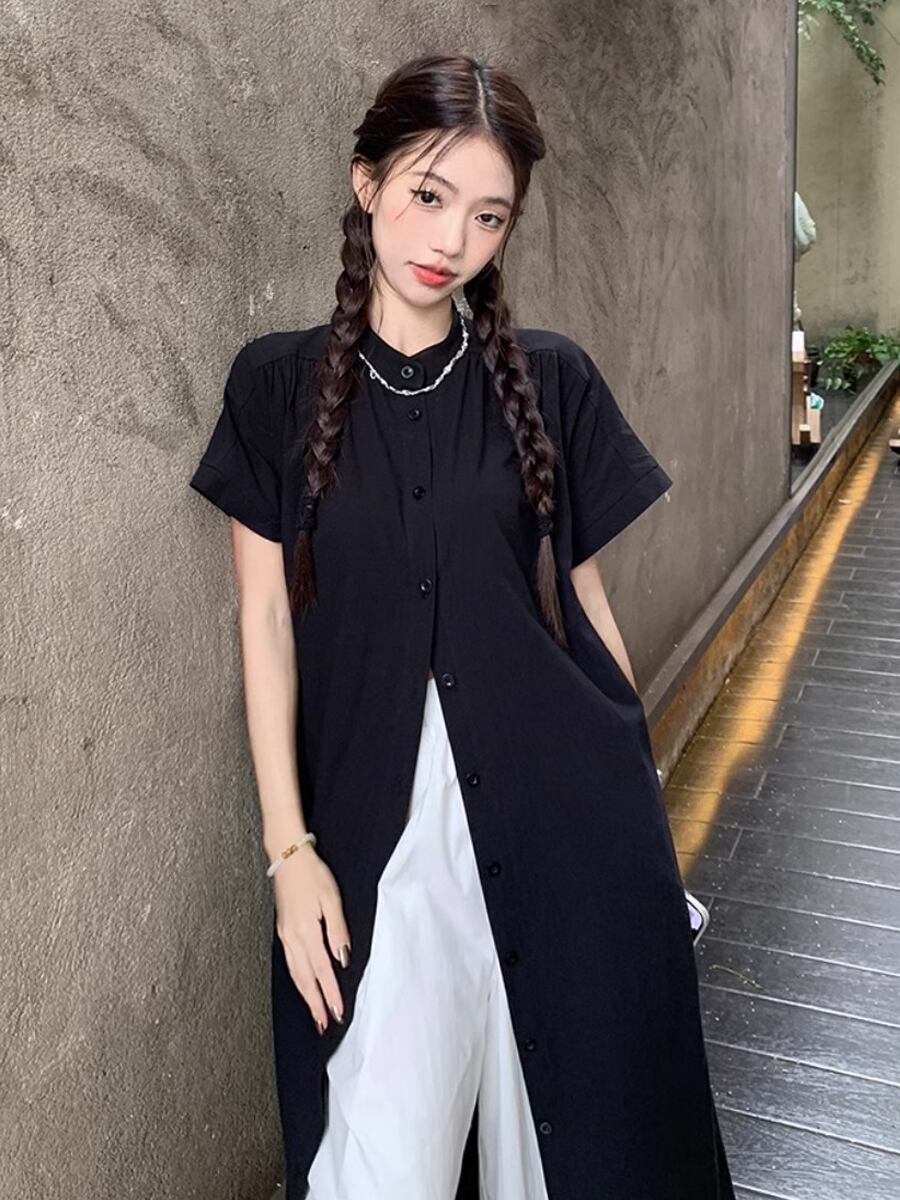 ブラック半袖ノーカラーロングシャツブラウス シャツブラウス 黒 ブラック フレンチスリーブ シャツ ブラウス 羽織り 薄め生地 襟なし 日焼け対策 日焼け防止 上着 カーディガン ブラウス シャツ 半袖 冷房対策 半袖 ゆったりめ 羽織り シングルボタン かわいい 大人可愛い きれいめ シンプル カジュアル 大人 上品 楽ちん おしゃれ お洒落 大人可愛い 大人女子 こなれ感 ラフ ガーリー 春 夏 レディース 学生 韓国コーデ 韓国ファション 黒