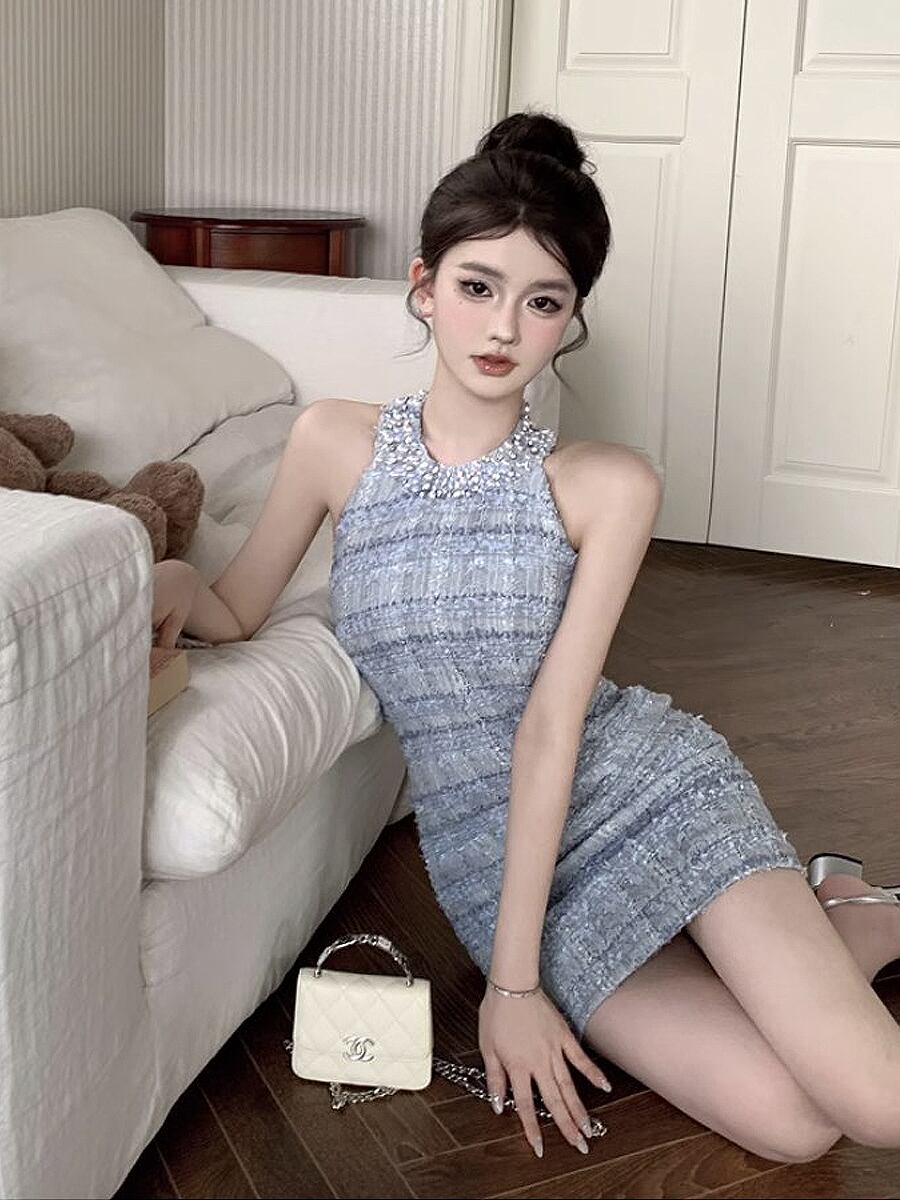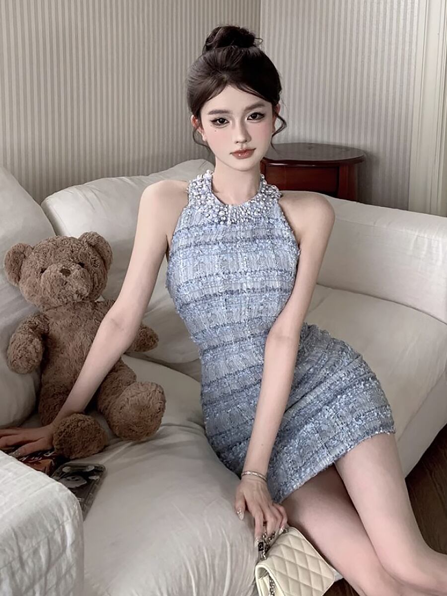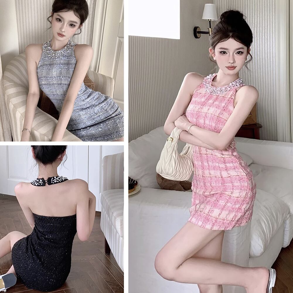 全3色 ビジュー付きホルターネックミニドレス キャミソールワンピース ワンピドレス パーティドレス ミニドレス ミニワンピ カジュアルドレス チェック柄 チェック パールビーズ ビジュー ブラックドレス 大人 上品 大人女子 膝上 ミニ ミニ丈 フェミニン パーティ デート かわいい 大人可愛い お洒落 結婚式 大人可愛い 大人女子 こなれ感 ラブリー お呼ばれ レディース デート お出かけ 韓国コーデ 韓国ファッション ピンク ブルー ブラック くすみブルー 黒 青