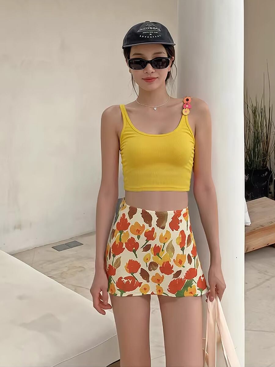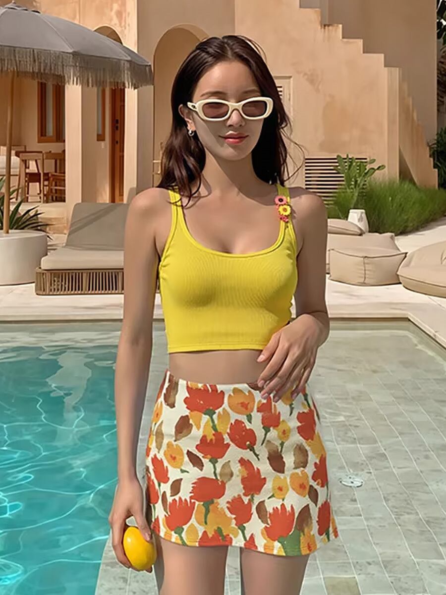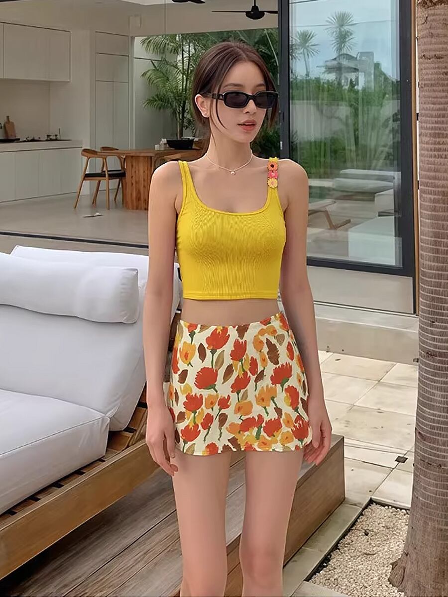 3点セット 水着 キャミソール風ビキニ上下+セミタイトスカート ビキニ タンキニ タイトスカート スポーティ 肩飾り お花モチーフ 花柄スカート タイトスカート風パレオ イエロー 黄色 ビタミンカラー 日焼け防止 パッド付き かわいい 大人可愛い おしゃれ ラブリー キュート レディース ビーチ プール リゾート 旅行 体系カバー 美脚 脚長 スタイルアップ 美スタイル モテ インスタ映え 韓国コーデ 韓国ファッション