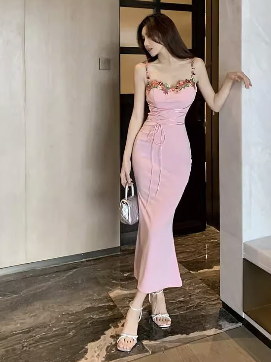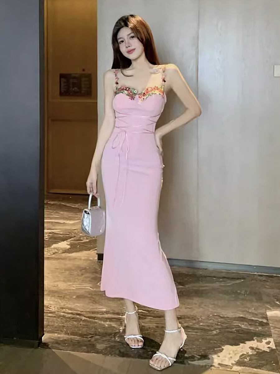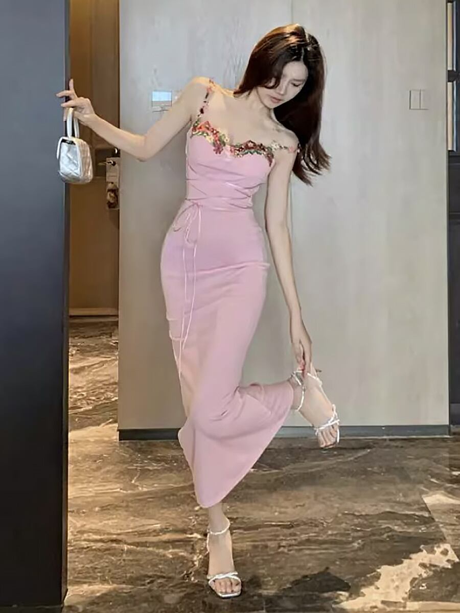 ピンク花柄刺繍レースアップキャミソールワンピースドレス フィット タイトワンピ タイト ピンク レースアップ ストラップ刺繍 キャミワンピ 膝下 フレア フィッシュテール ボディコン パーティ 結婚式 二次会 イベント かわいい 大人可愛い きれいめ シンプル カジュアル 上品 おしゃれ お洒落 かっこいい 大人女子 こなれ感 ラブリー キュート ガーリー 個性的 モード系 エレガント モダン 韓国ファション 韓国コーデ