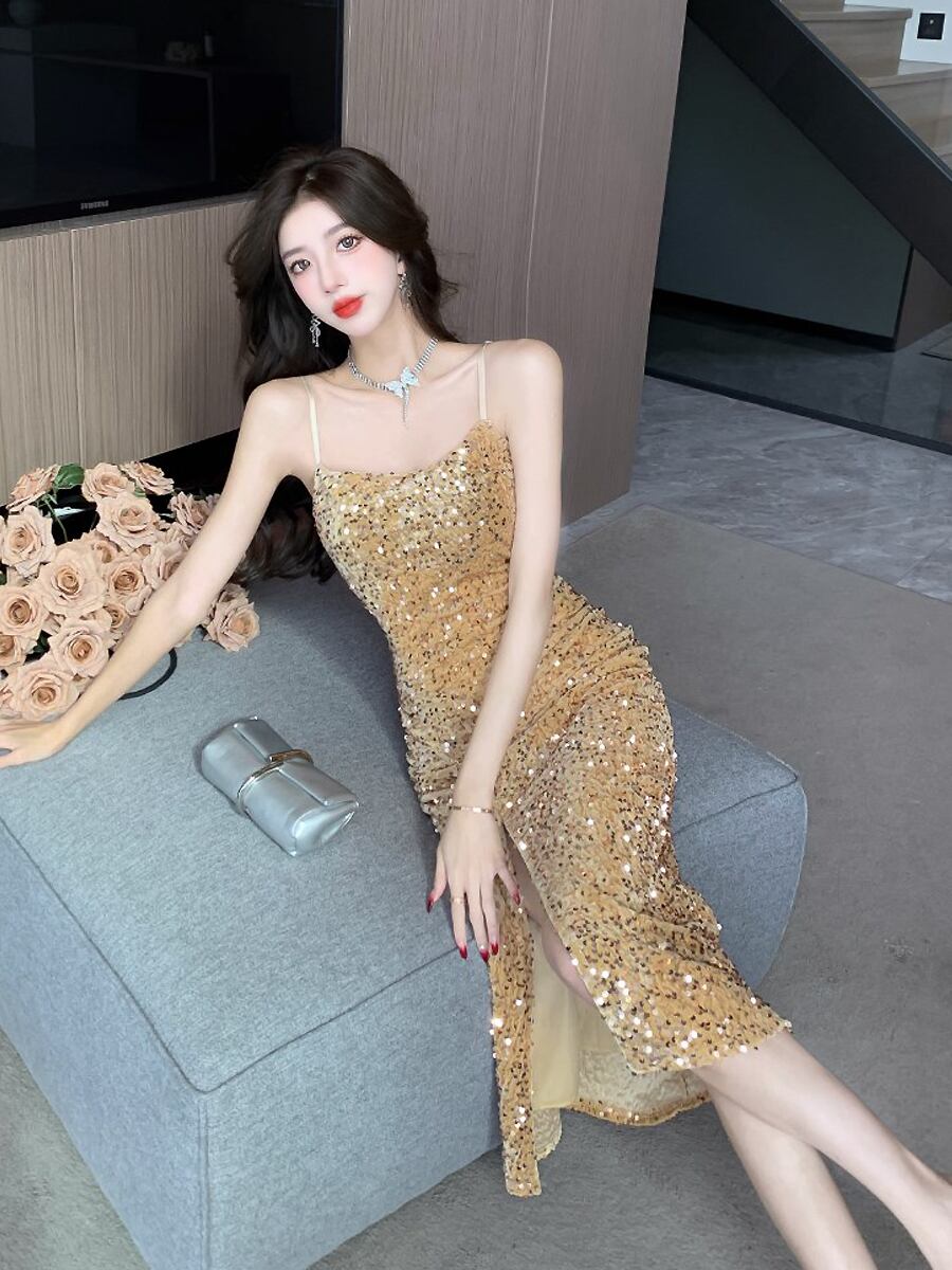 全3色 キラキラスパンコールキャミドレス キャミドレス スパンコール メタリック ラメ サイドスリット スリット セクシー ミモレ丈 ミドル丈 キャミソールドレス ワンピースドレス 肩出し 大人っぽい セクシー 華やか タイトシルエット ドレス ナイトドレス パーティドレス ロング パーティ 結婚式 二次会 イベント きれいめ シンプル 上品 かっこいい 大人女子 こなれ感 モード系 エレガント モダン 韓国ファション 韓国コーデ 黒 ブラック ゴールド シルバー 銀色 金色