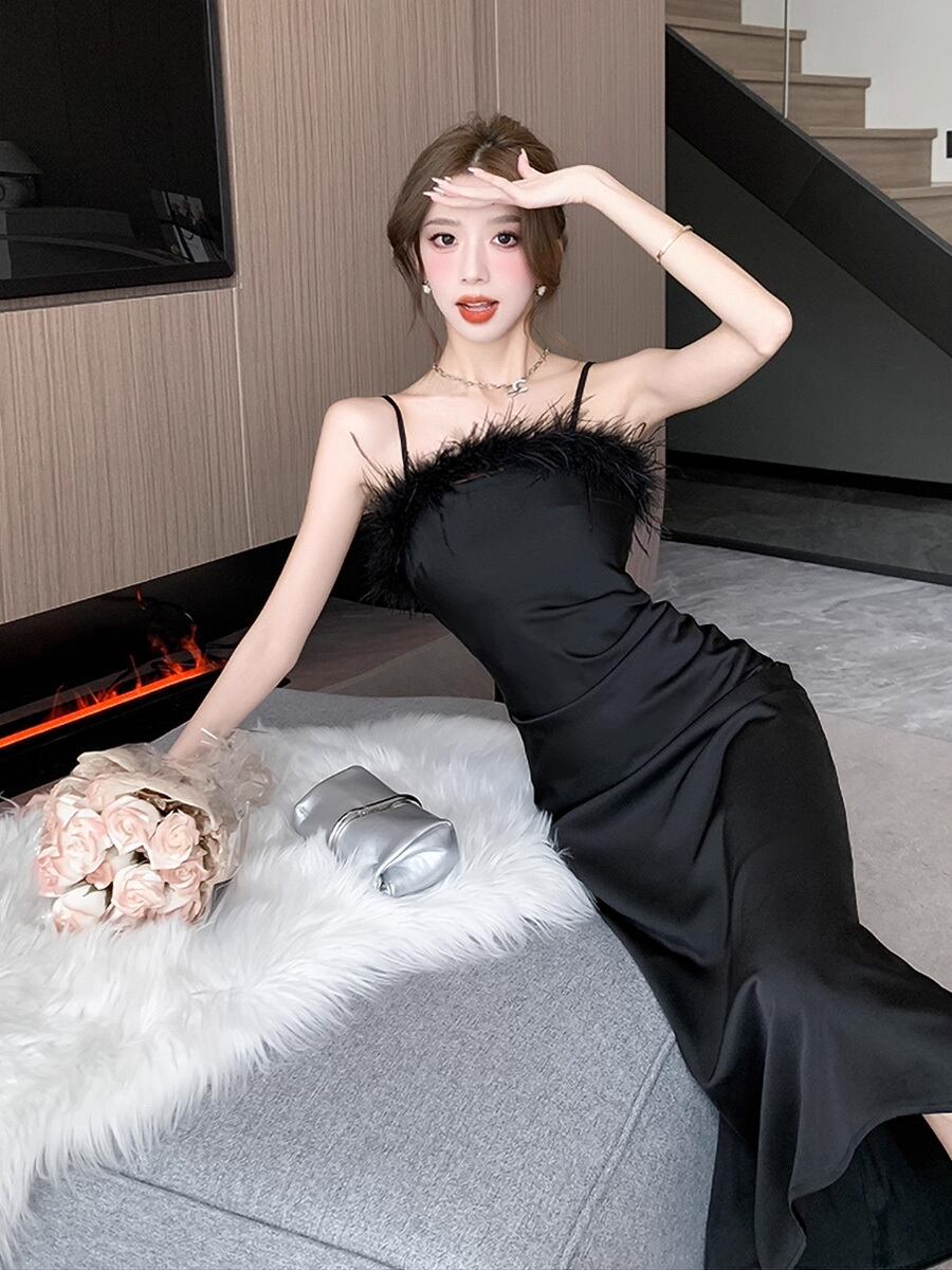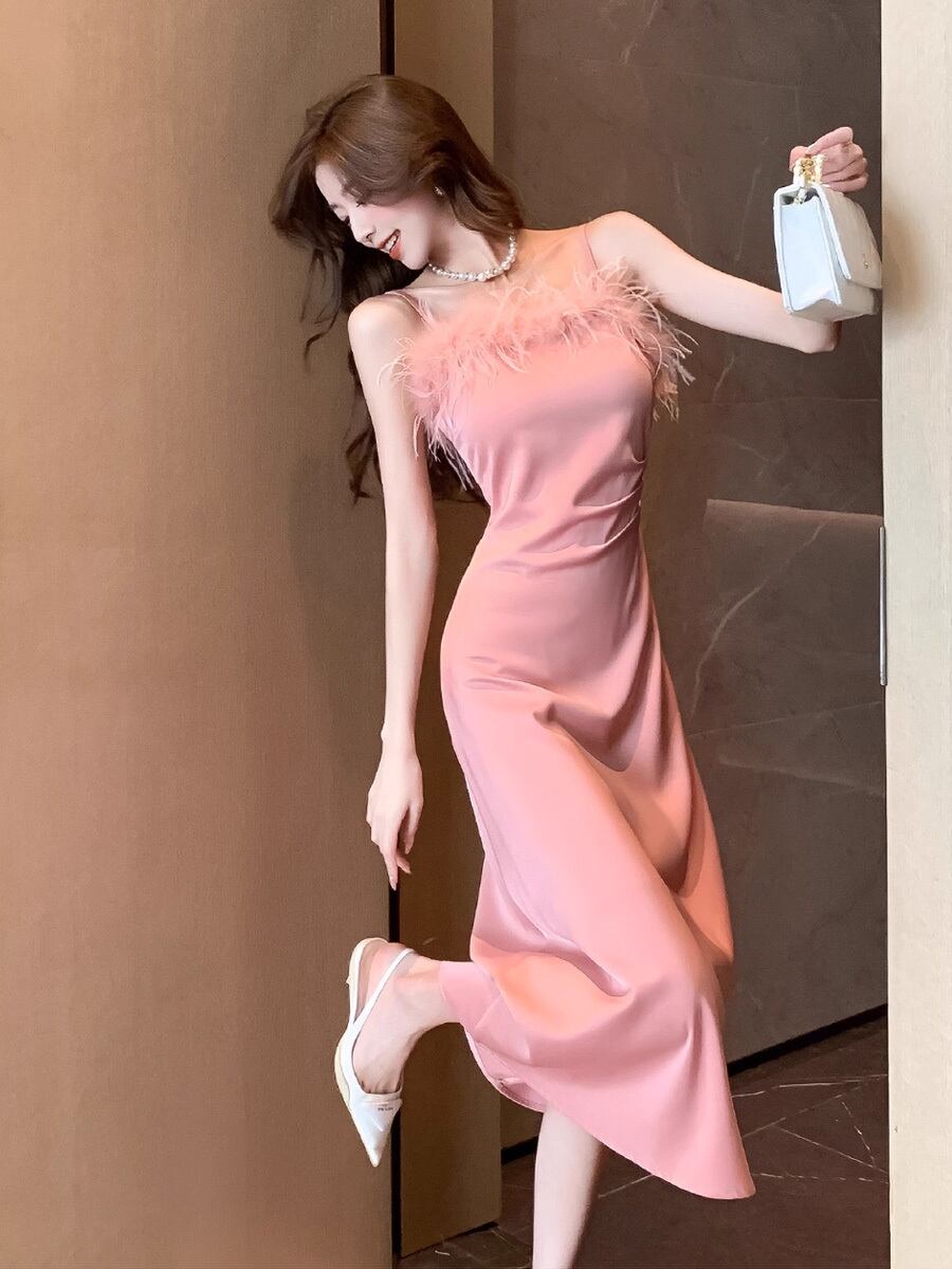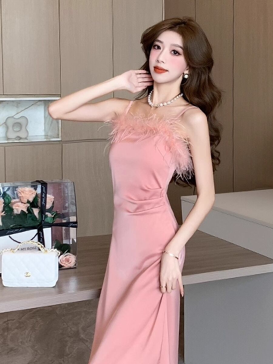全2色 羽付きパーティドレス キャミドレス ワンピースドレス ワンピドレス キャミソールドレス 光沢感 マーメイドライン マーメイドドレス フィッシュテール フェザー 羽 羽付き 羽飾り 肩出し 大人っぽい セクシー ドレス ナイトドレス ロング パーティ 二次会 イベント お食事会 懇親会 かわいい 大人可愛い きれいめ 上品 おしゃれ お洒落 かっこいい 大人女子 こなれ感 モード系 エレガント 韓国ファション 韓国コーデ 黒 ブラック ピンク