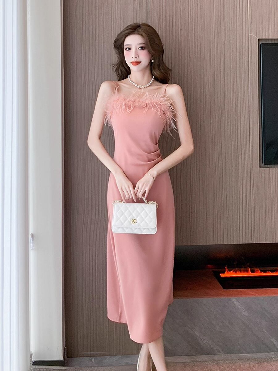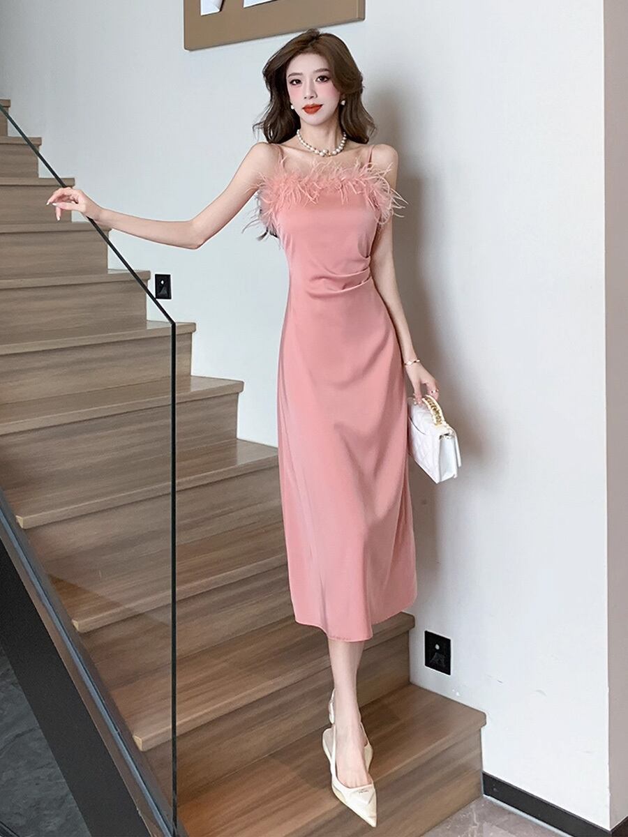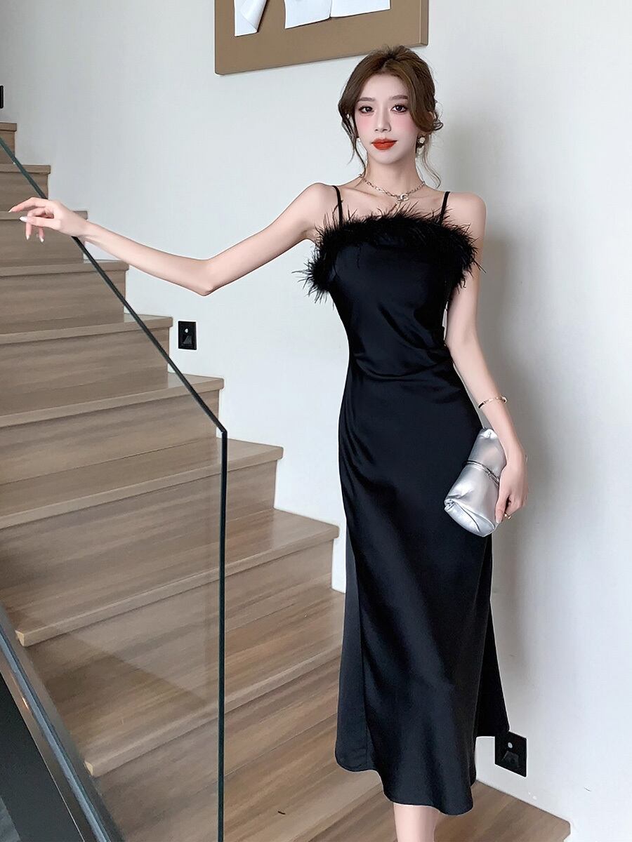 全2色 羽付きパーティドレス キャミドレス ワンピースドレス ワンピドレス キャミソールドレス 光沢感 マーメイドライン マーメイドドレス フィッシュテール フェザー 羽 羽付き 羽飾り 肩出し 大人っぽい セクシー ドレス ナイトドレス ロング パーティ 二次会 イベント お食事会 懇親会 かわいい 大人可愛い きれいめ 上品 おしゃれ お洒落 かっこいい 大人女子 こなれ感 モード系 エレガント 韓国ファション 韓国コーデ 黒 ブラック ピンク